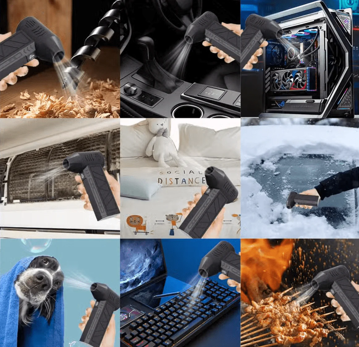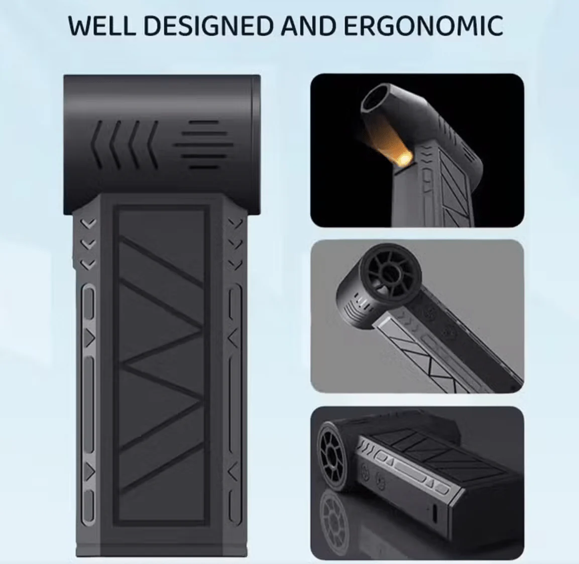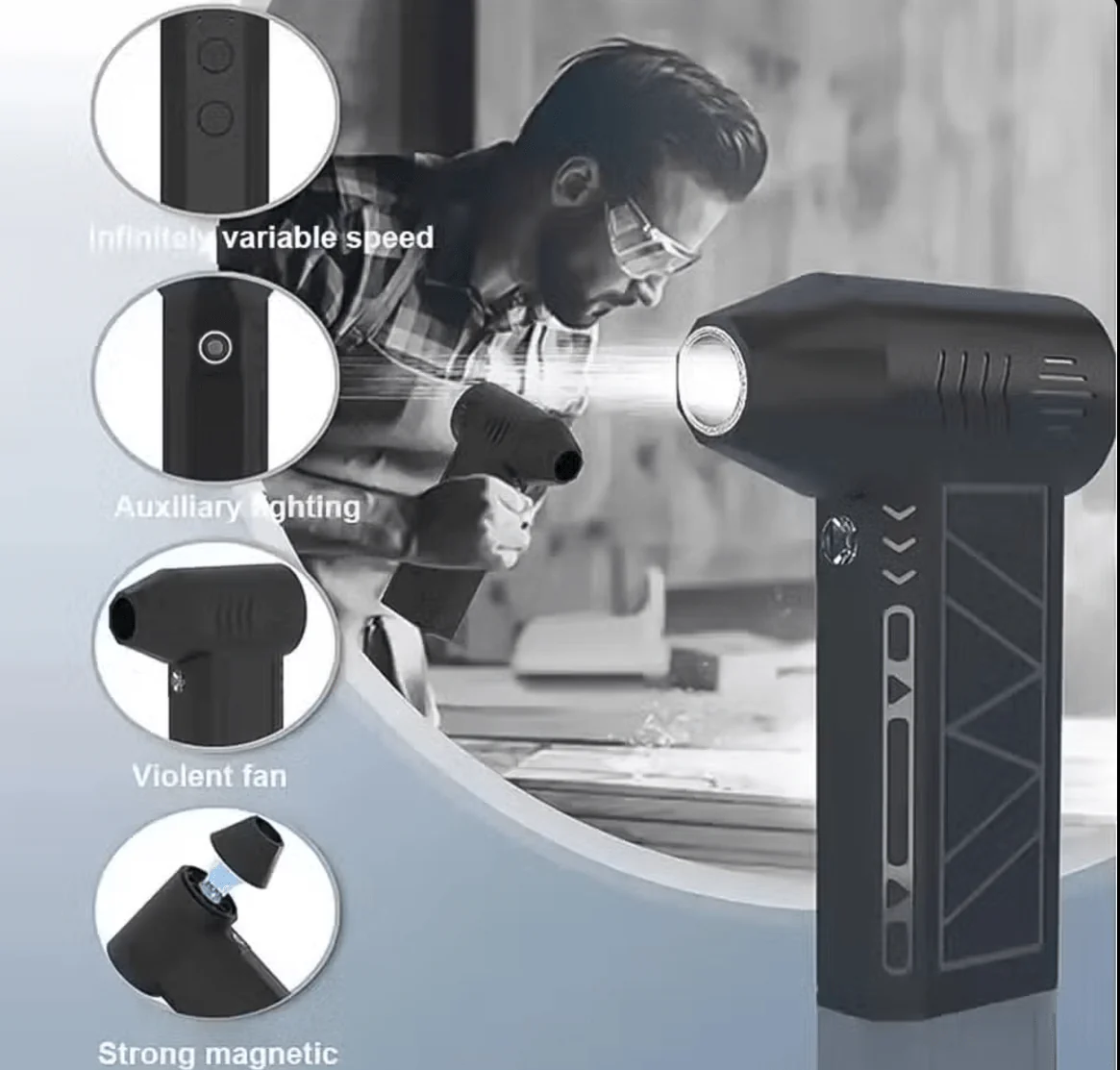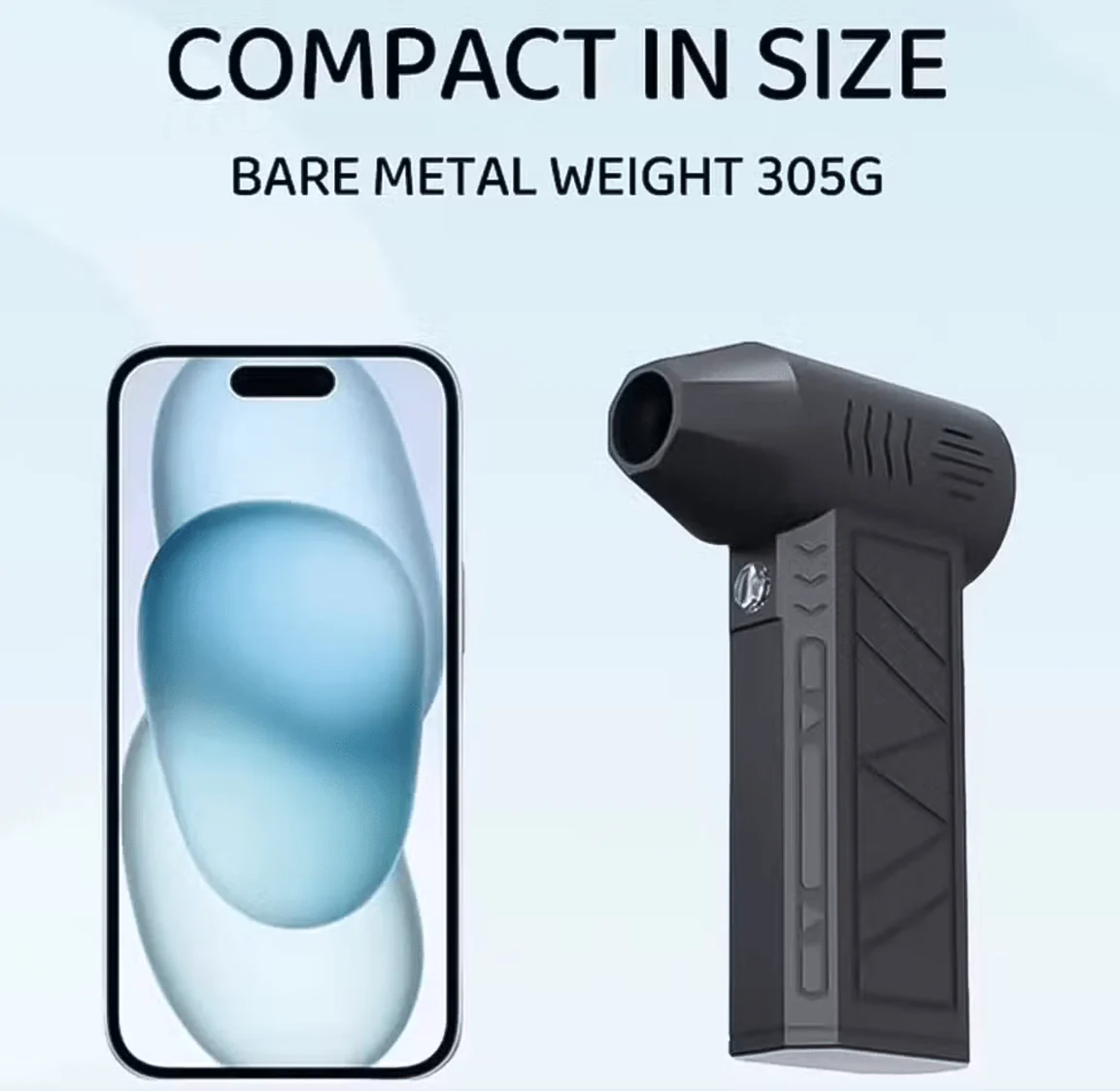 The Mini Jet Fan is a compact yet powerful blower featuring an ultra-high-speed brushless motor for strong consistent airflow. Perfect for cleaning tight spaces electronics or providing a refreshing breeze this fan combines efficiency portability and convenience in one device. Its cordless lightweight design allows ultimate mobility making it ideal for indoor or outdoor use. The magnetic suction nozzle ensures secure attachment to metallic surfaces offering stability while in operation. The advanced brushless motor provides enhanced efficiency longer lifespan and minimal maintenance compared to traditional fans. Constructed from durable ABS plastic with precision electronics the Mini Jet Fan is easy to maintain. Simply wipe the exterior with a dry microfiber cloth and avoid water exposure. Compact versatile and reliable it’s perfect for home office or professional use. Features: - Ultra-high-speed brushless motor for powerful airflow - Cordless and lightweight for portability - Magnetic suction nozzle for secure attachment - Ideal for cleaning electronics or hard-to-reach spaces - Efficient brushless motor with longer lifespan - Compact and easy to store