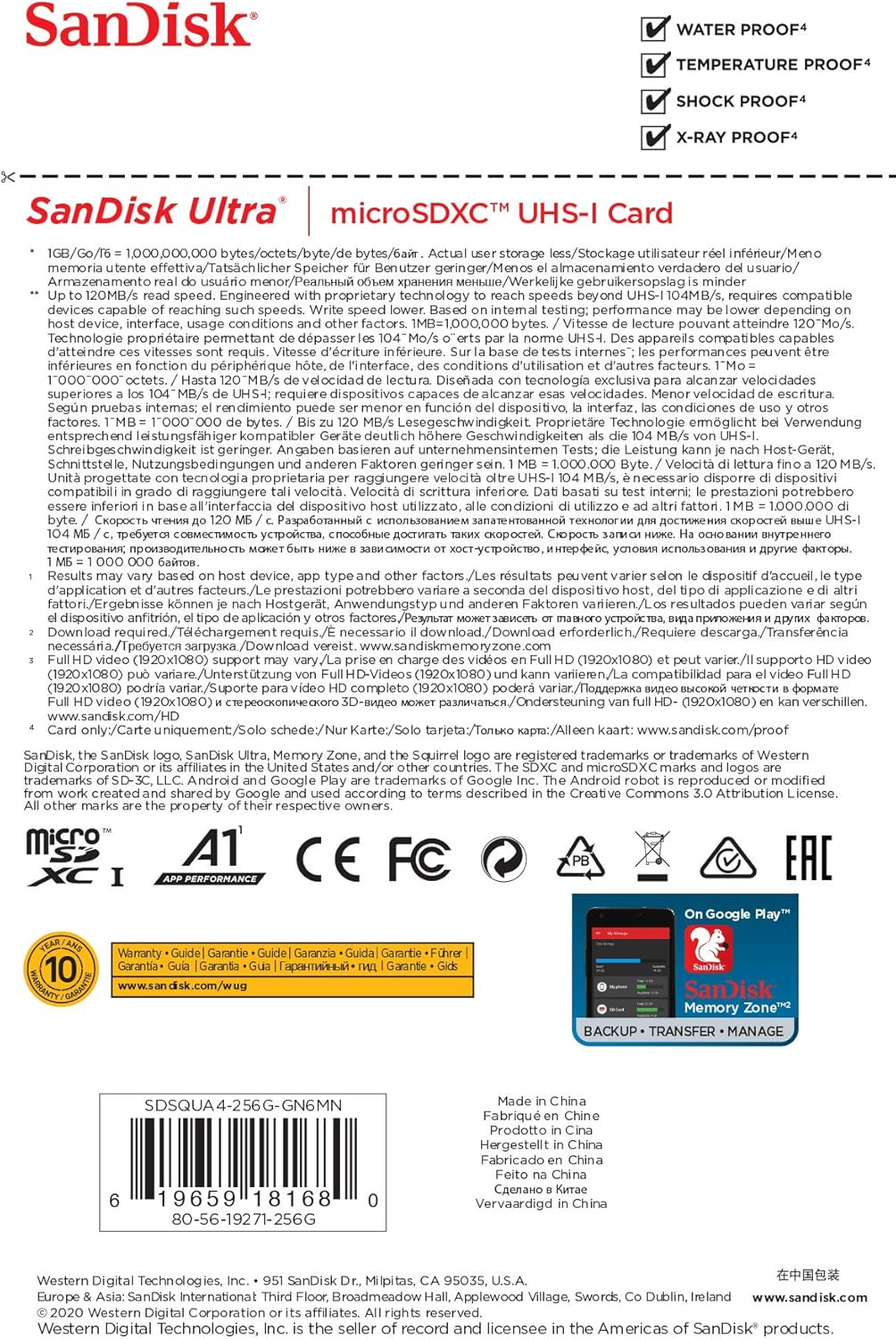 The SanDisk Ultra MicroSDXC Class 10 A1 Memory Card 256GB Multicolour is a high-capacity, high-performance memory card designed for smartphones, tablets, cameras, and other devices that require reliable and fast storage. With 256GB of storage, it allows you to store thousands of photos, hours of Full HD and 4K videos, apps, and other large files without worrying about running out of space.