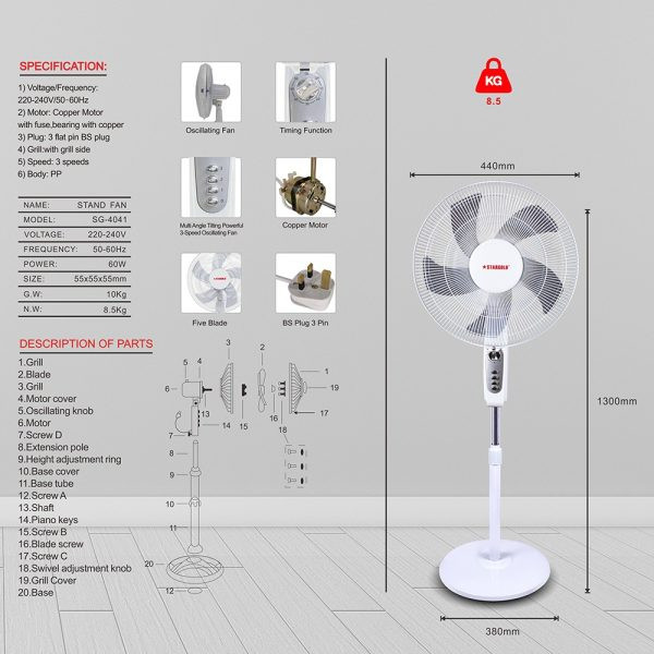 Whether it’s a hot summer day or an unexpected power cut, the STARGOLD SG-4041 Pedestal Fan keeps your environment cool, comfortable, and well-lit.
