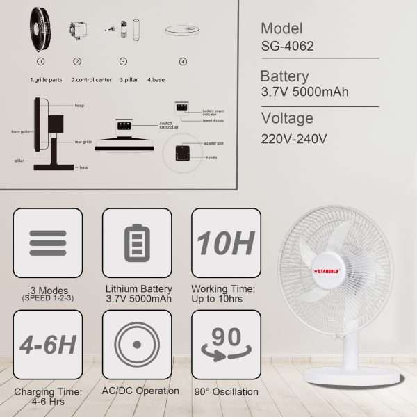 Beat the heat with the STARGOLD SG-4062 White Portable 10-Inch Rechargeable Table Fan. Compact, quiet, and versatile, this fan is designed for home, office, or outdoor use. Its rechargeable 5000mAh lithium battery provides up to 7 hours of continuous airflow, ensuring comfort anytime, anywhere.