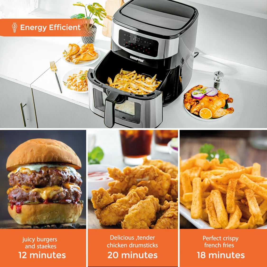 Cook tasty and healthy meals for your whole family with the Geepas Digital Air Fryer GAF37524UK. It has a big 9.2L capacity, perfect for feeding a large group, and uses advanced Vortex Air Frying Technology for quick, even, and oil-free cooking. The LED touchscreen makes it easy to use, with 9 preset cooking modes that let you fry, grill, roast, bake, or reheat with ease. You can adjust the temperature between 80°C and 200°C and set a timer from 1 to 60 minutes, ensuring every meal comes out crispy and tender. This air fryer combines strength, size, and good looks, making it a great choice for families who want to cook healthy and conveniently.