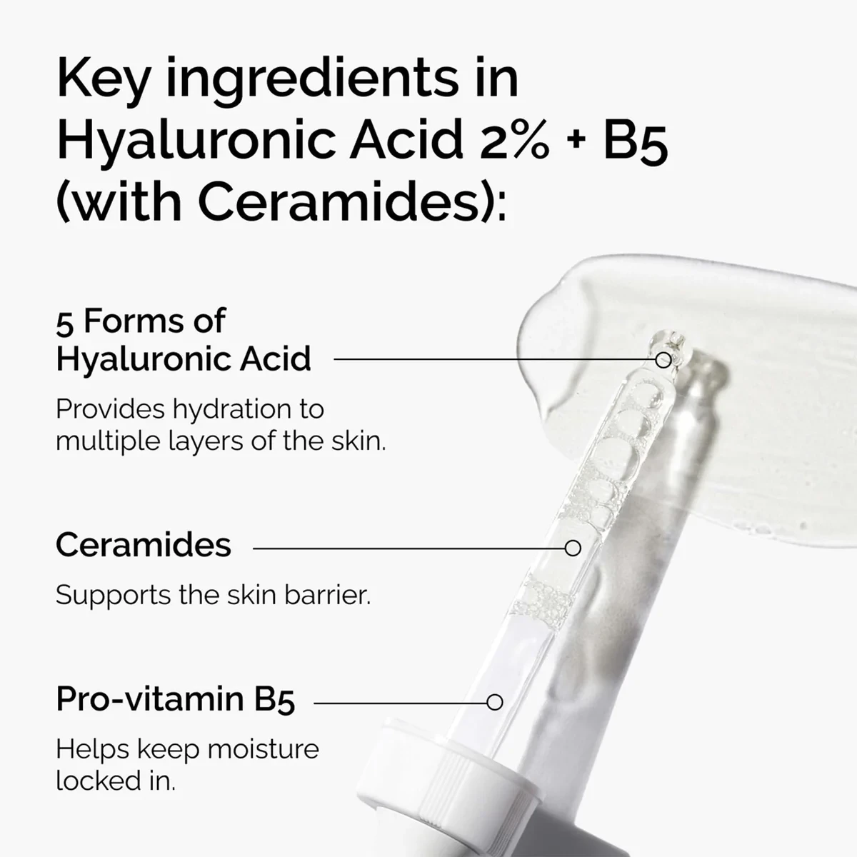 The Ordinary Hyaluronic Acid 2% + B5 is a clinically informed hydrating serum designed to deliver intense, multi-depth moisture to the skin. Formulated with five forms of hyaluronic acid, the lightweight serum works to visibly plump, smooth and refresh the complexion while improving overall skin texture.