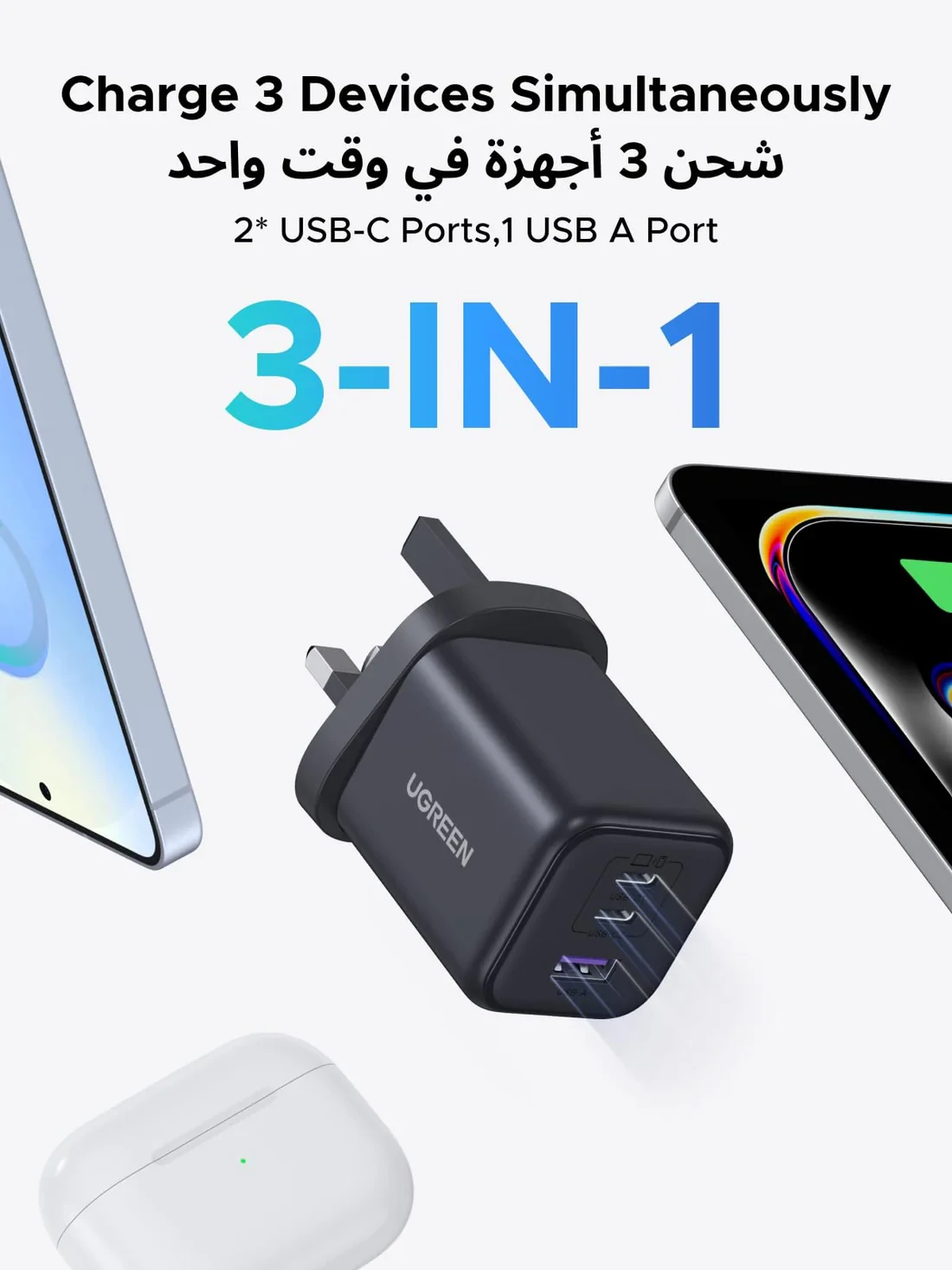 The UGREEN 45W 3-Port USB-C Charger combines compact design, high-speed performance, and universal compatibility to keep all your devices powered anytime, anywhere. Built with advanced GaN technology, this charger delivers efficient power in a smaller, cooler, and portable form factor, making it ideal for travel, office, or daily use.