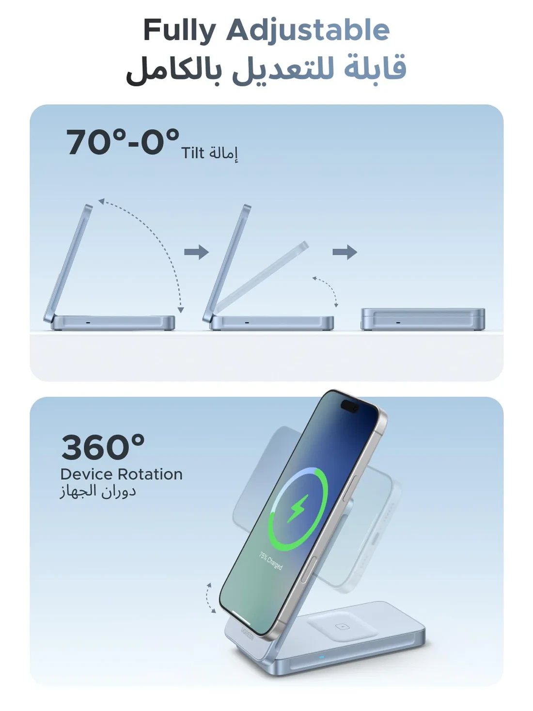 Designed with convenience in mind, the charger features 360° rotation and a 70° adjustable viewing angle, allowing you to comfortably watch videos, join video calls, or browse while charging.
