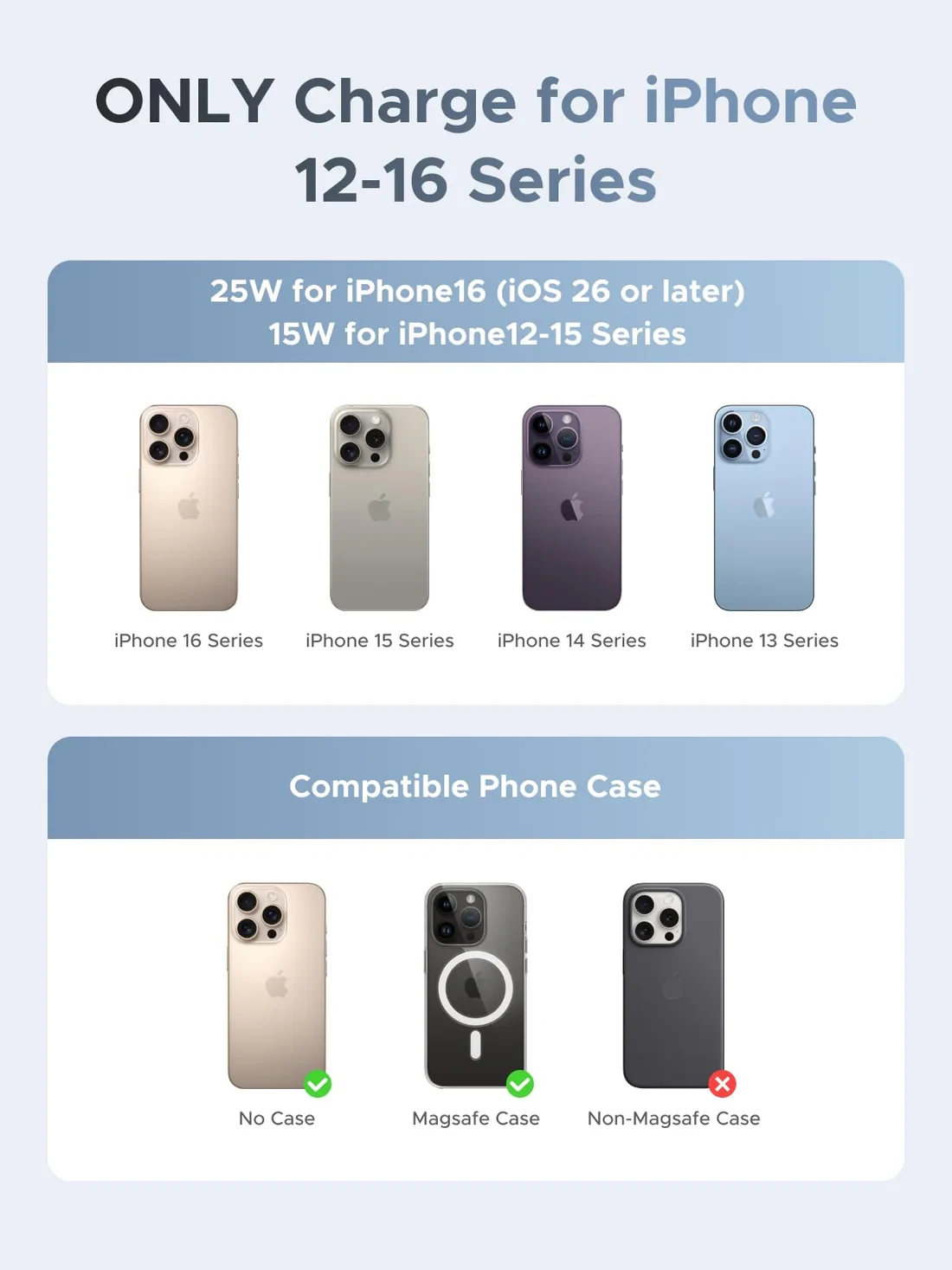 The charger supports the newest Qi2 protocol, delivering up to 25W fast wireless charging for supported iPhone models. It charges compatible devices quickly while maintaining optimal temperature control for safe and efficient performance.