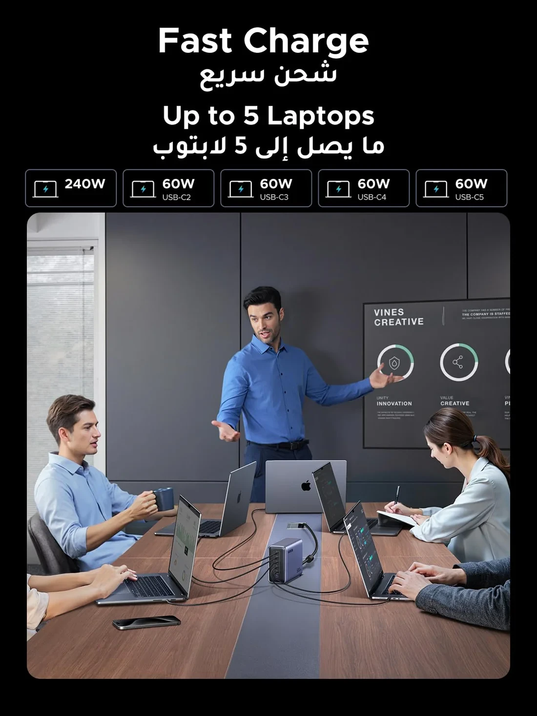 Additional USB-C ports (C2–C5) provide up to 100W fast charging, ensuring high-speed power delivery for multiple laptops and tablets.