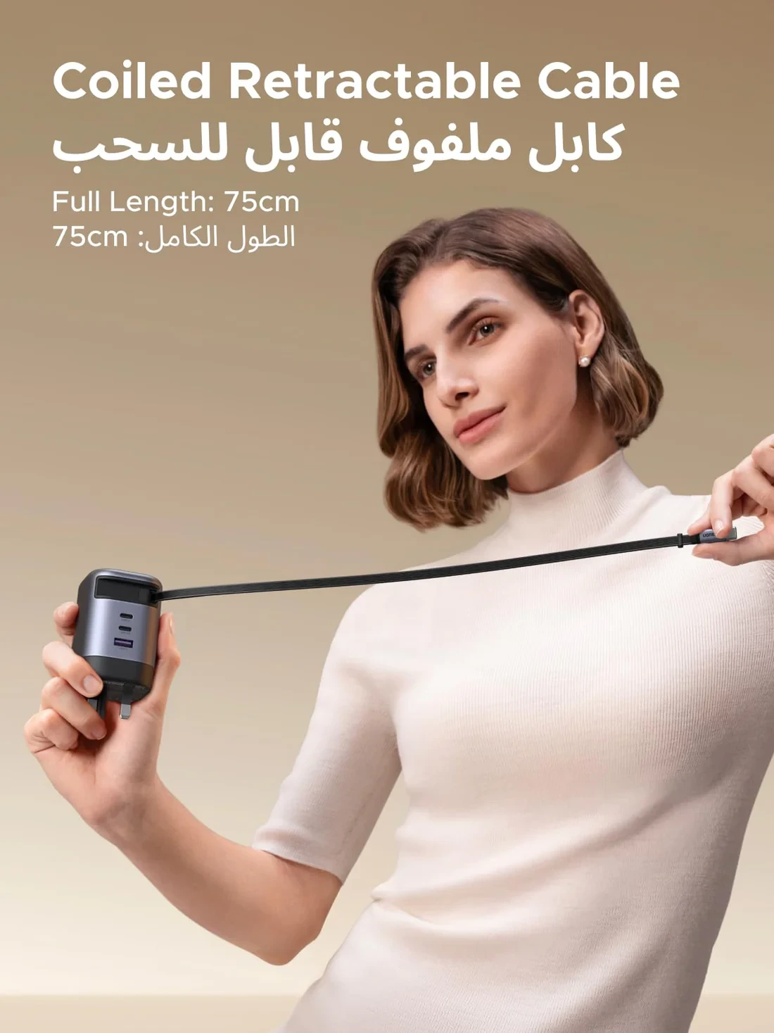 The charger includes a 75cm smart retractable USB-C cable. Simply pull out the cable when needed and release it to automatically retract, keeping your workspace neat and tangle-free. Its compact design makes it perfect for travel.