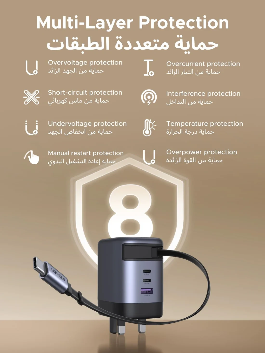 Power all your devices with the UGREEN 100W Nexode GaN USB-C Charger. Designed with a built-in retractable cable and multiple charging ports, this compact charger provides fast, efficient, and safe charging for laptops, smartphones, tablets, and accessories. Perfect for home, office, or travel.