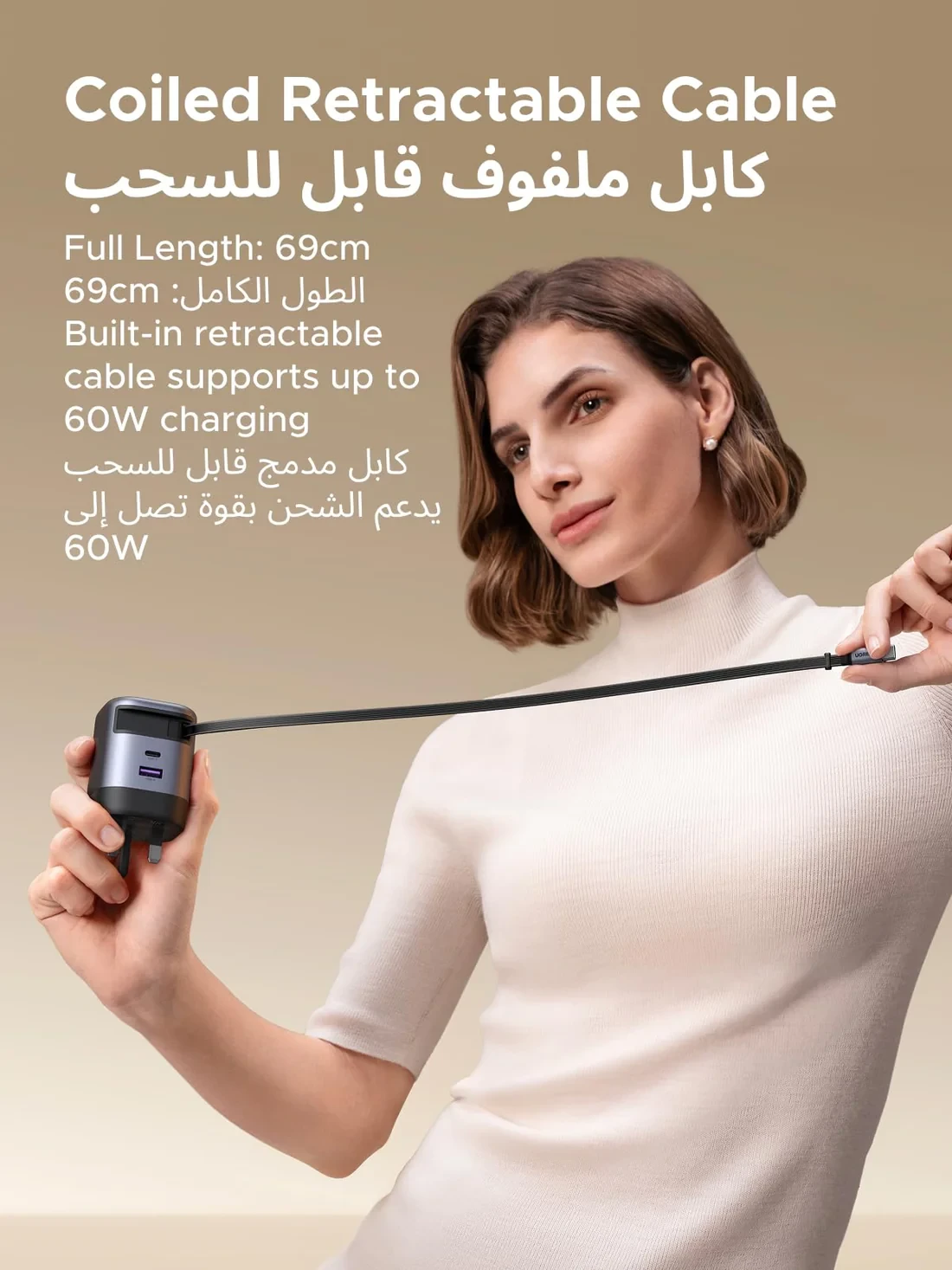 The charger features a 69cm retractable USB-C cable with auto-rewind, eliminating cable clutter and tangles. Despite the integrated cable, the charger is 30% smaller than standard 65W adapters, making it perfect for travel and daily carry.