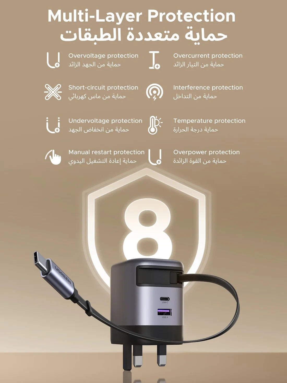 Powered by GaN technology, this charger provides higher efficiency, less heat generation, and compact size. It also includes 8-layer safety protection, guarding against overvoltage, overheating, overpower, undervoltage, and short circuits.