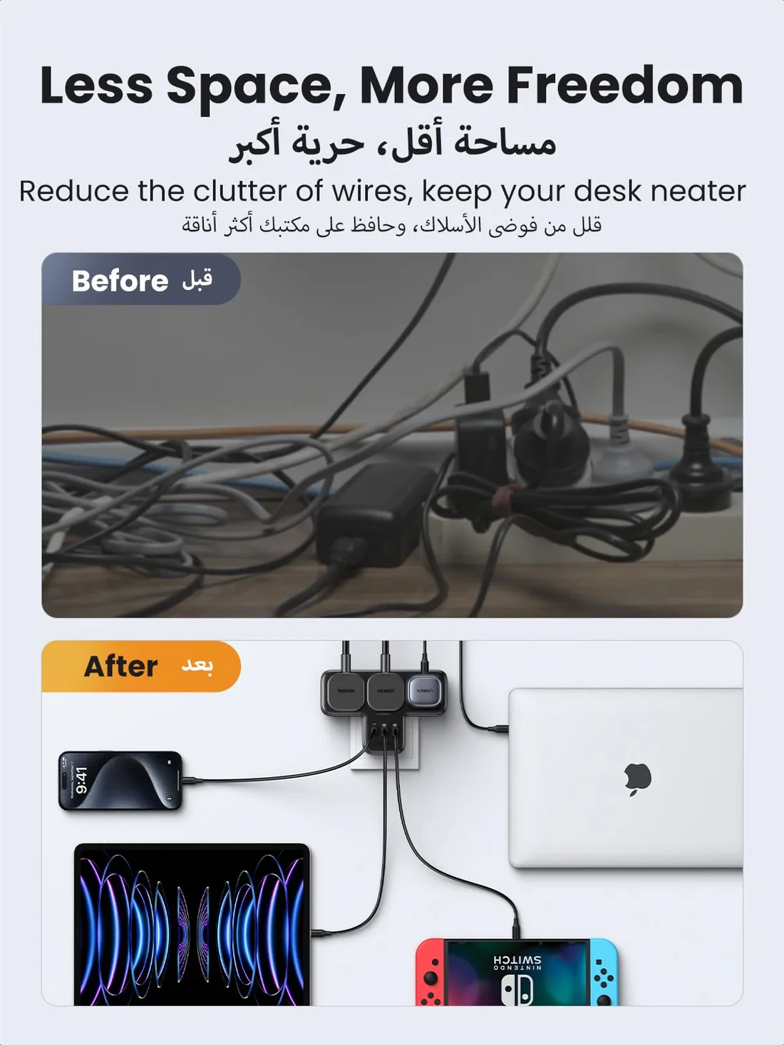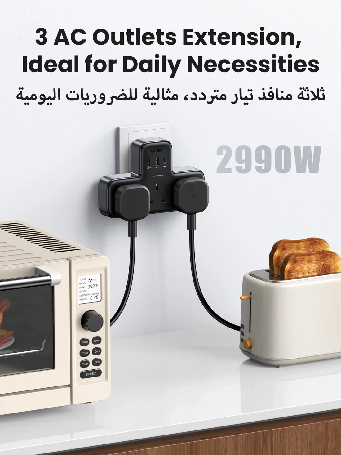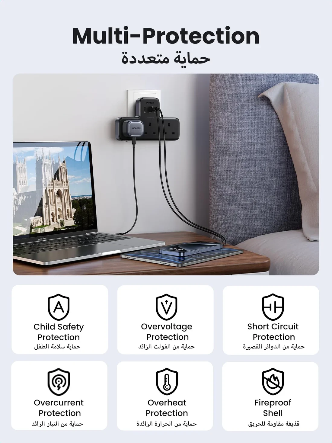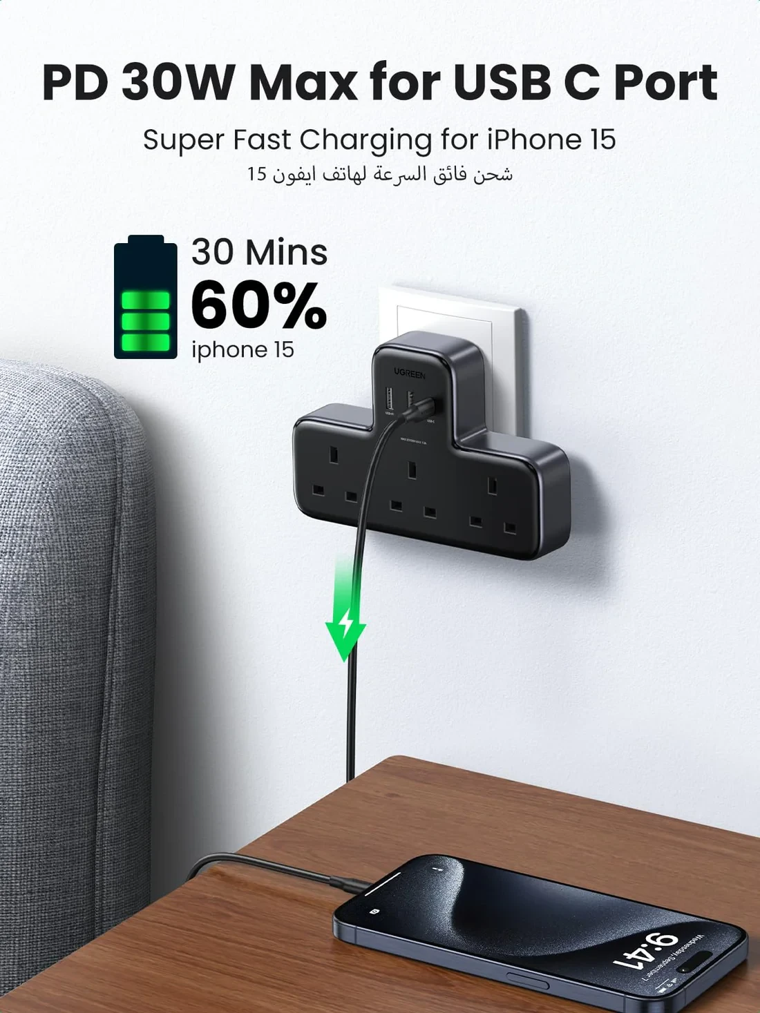 Charge multiple devices efficiently with the UGREEN 6-in-1 Travel Plug Adapter. Featuring 3 Type-G AC outlets and 3 USB ports (PD 30W USB-C + 2 USB-A), this adapter allows you to power up to 6 devices simultaneously. Perfect for home, office, or kitchen use, it eliminates the need for messy extension cords.