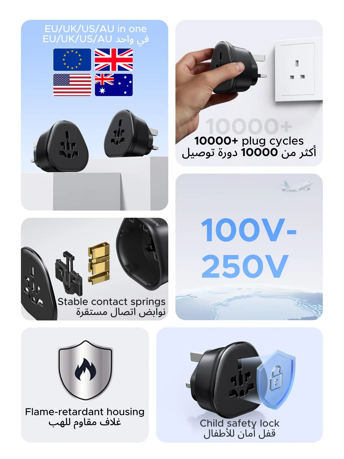 Travel effortlessly with the UGREEN Universal Travel Plug Adapter, designed to provide safe, reliable, and compact power access in over 200 countries. With support for US, EU, UK, AU, China, Japan, Canada, Hong Kong, Singapore, and more, it allows you to charge your devices wherever your travels take you.
