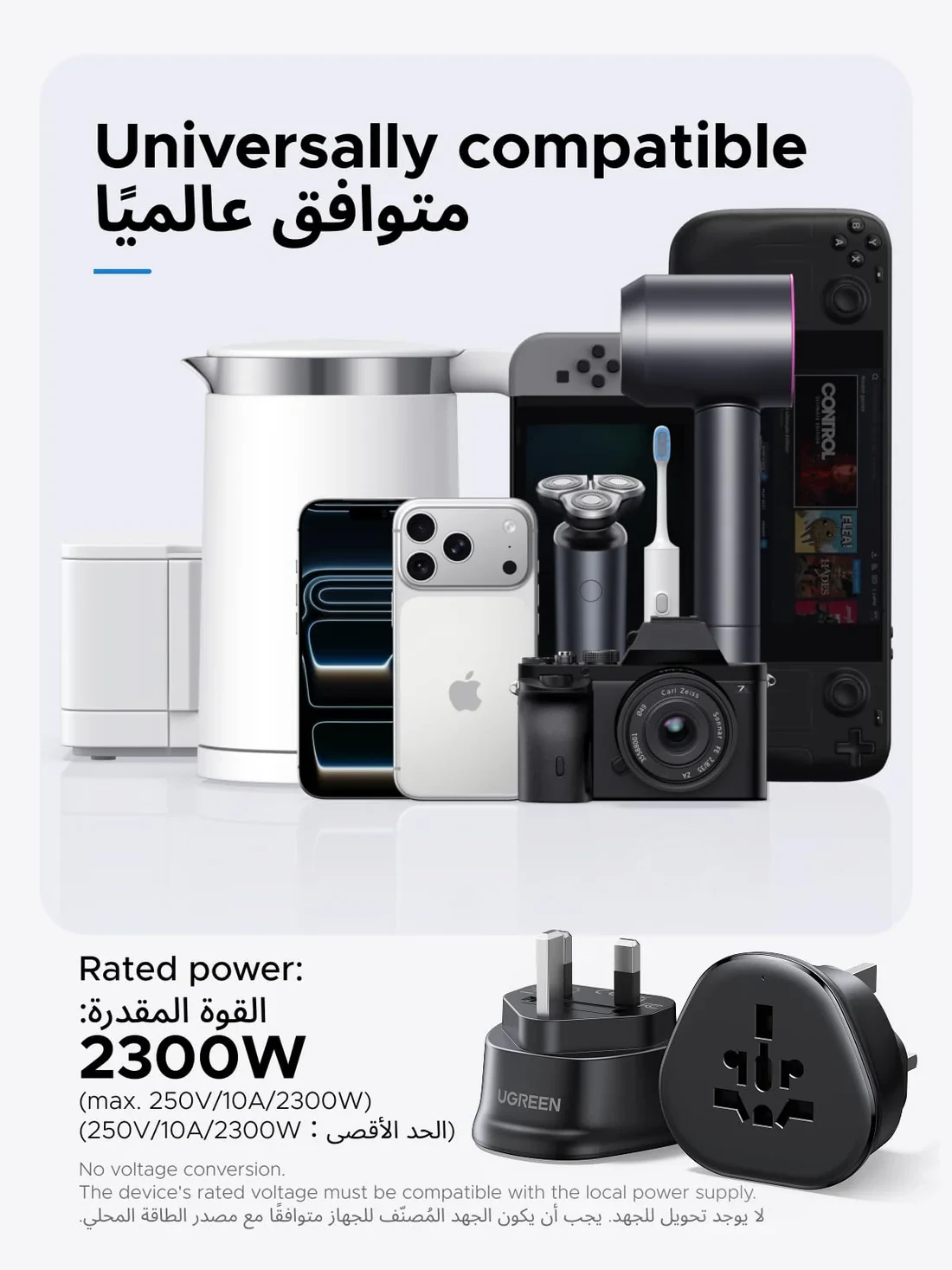The adapter converts any AC plug to a Type-G (UK) outlet, enabling you to connect devices from one region to another easily. It works in over 200 countries, including AE, UK, SA, Qatar, Oman, Kuwait, Ireland, Hong Kong, Singapore, and more.
