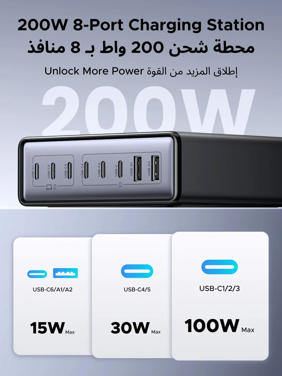 This 8-port GaN charging station delivers a total 200W output, allowing you to charge multiple devices at once. It includes 6 USB-C ports and 2 USB-A ports, making it ideal for powering laptops, phones, tablets, and other USB devices simultaneously.