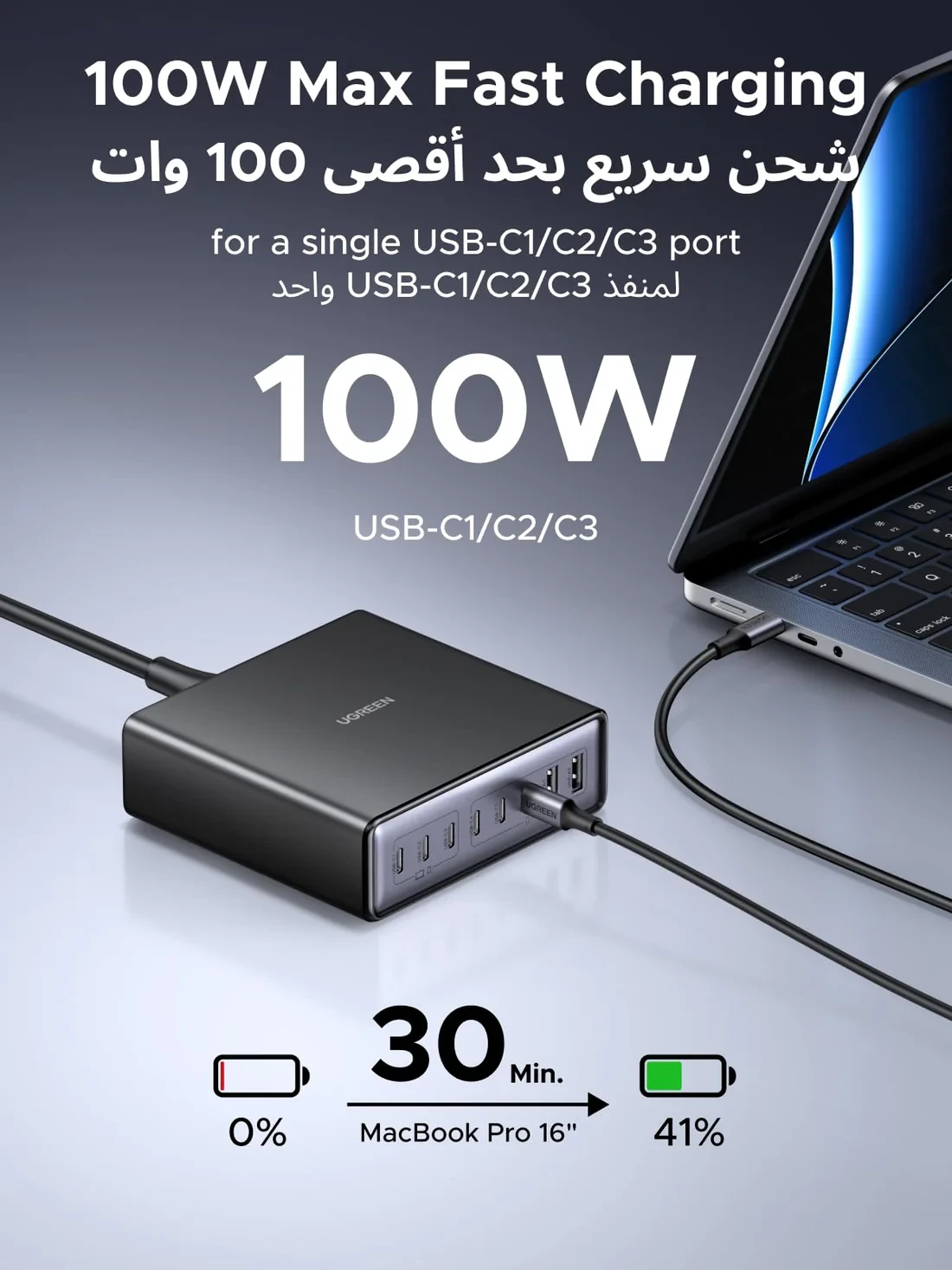 Three USB-C ports (C1, C2, and C3) provide up to 100W fast charging, capable of charging a 16-inch MacBook Pro to 41% in just 30 minutes, ensuring powerful performance for high-demand devices.