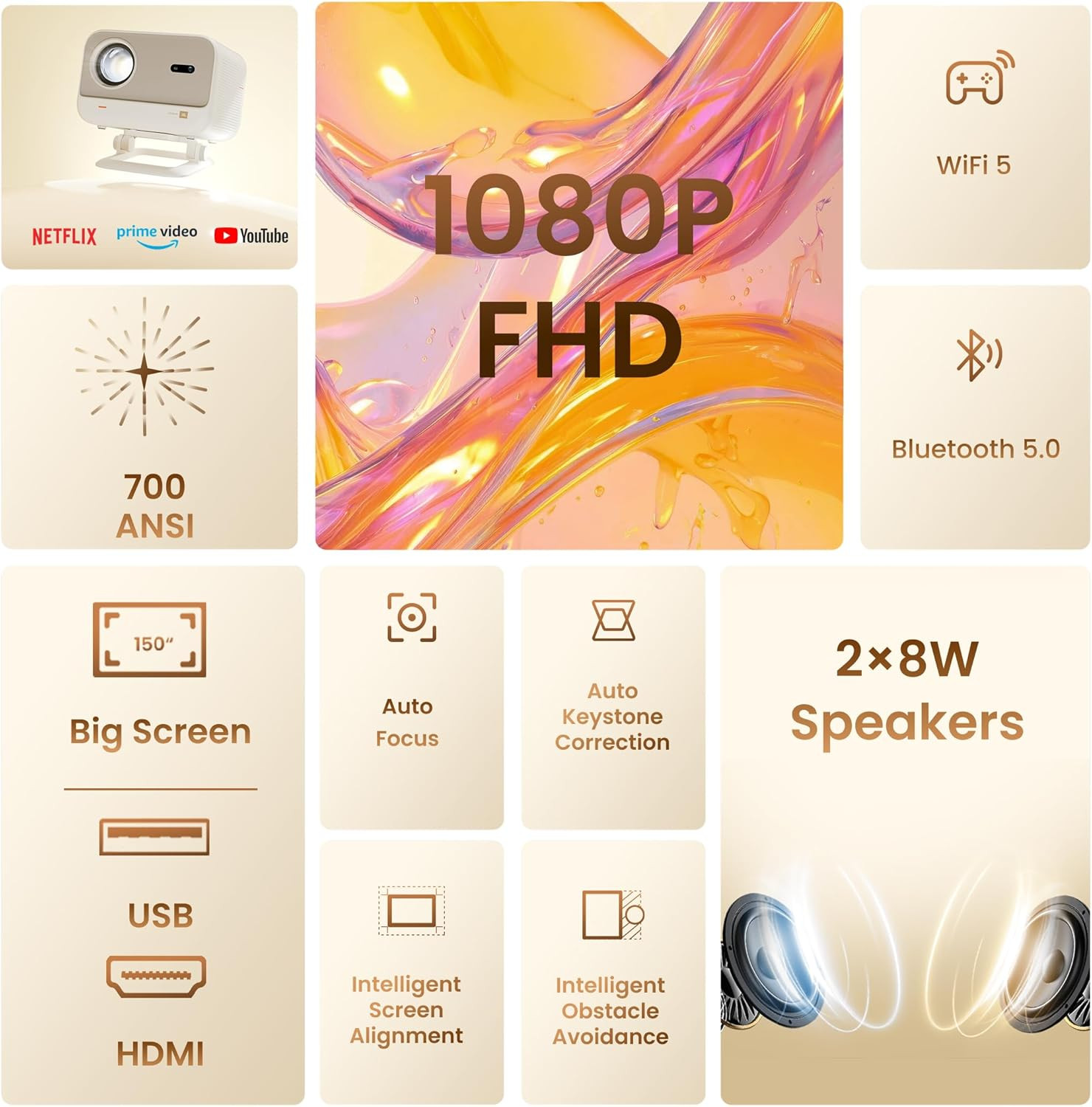 Enjoy breathtaking visuals with 700 ANSI lumens of brightness and native 1080P Full HD resolution, ensuring vibrant colors, sharp contrast, and cinematic realism even in moderate ambient light. The built-in Smart OS gives you direct access to Netflix, Prime Video, YouTube, and more, eliminating the need for extra streaming devices.