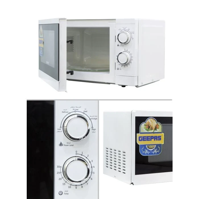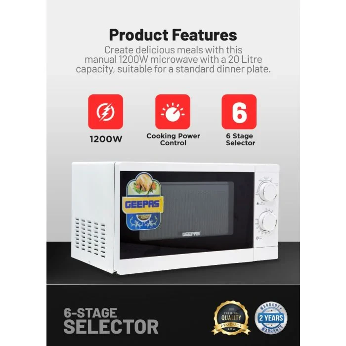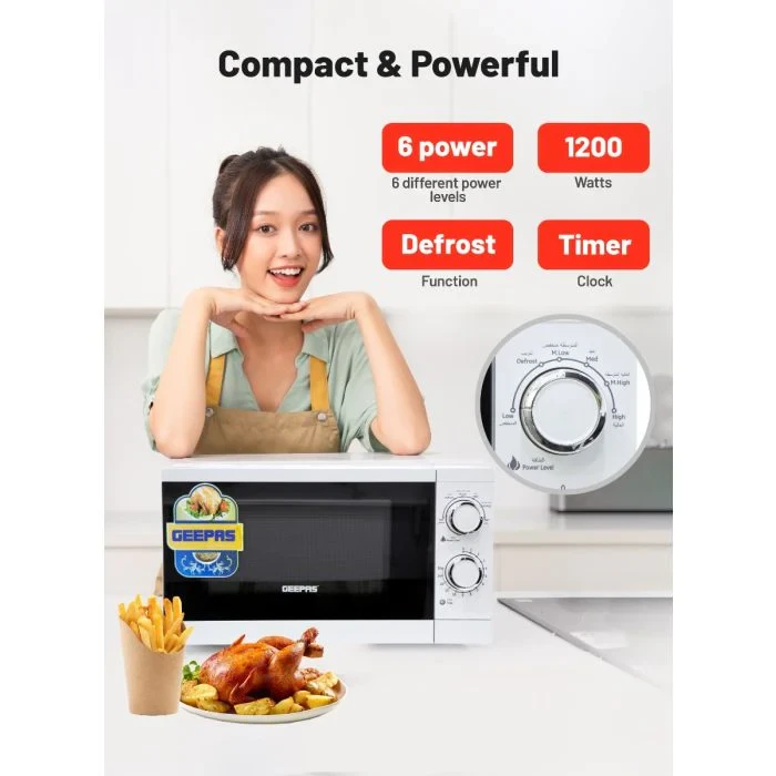 - 1200W power for quick and efficient cooking- 20L capacity for small to medium amounts of food- 6 adjustable power levels for different cooking needs- Timer function to control cooking time properly- Two rotary dials for easy control of power and time- Defrost settings for fast thawing of frozen foods- Compact design that saves space- Sleek white finish that looks modern in any kitchenSpecifications:- Brand: Geepas- Type: Solo Microwave Oven- Power: 1200W- Capacity: 20 Litres- Material: Metal body and plastic controls- Control Type: 2 Rotary Dials- Power Levels: 6- Defrost Function: Yes- Color: White- Suitable For: Heating, Cooking, Defrosting