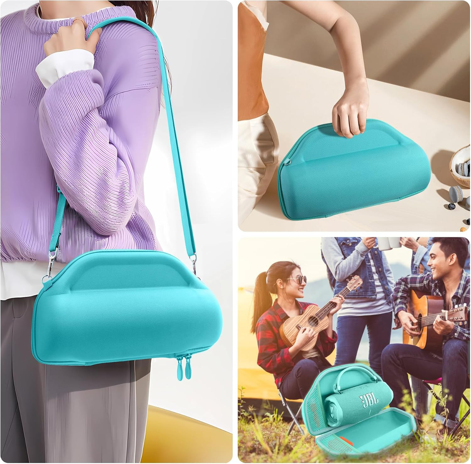 The smooth zipper closure ensures quick access, while the comfortable handle and detachable shoulder strap make carrying simple—whether you’re hiking, traveling, or enjoying an outdoor event. With its elegant teal design, the case not only looks great but also keeps your JBL Charge speaker fully protected.