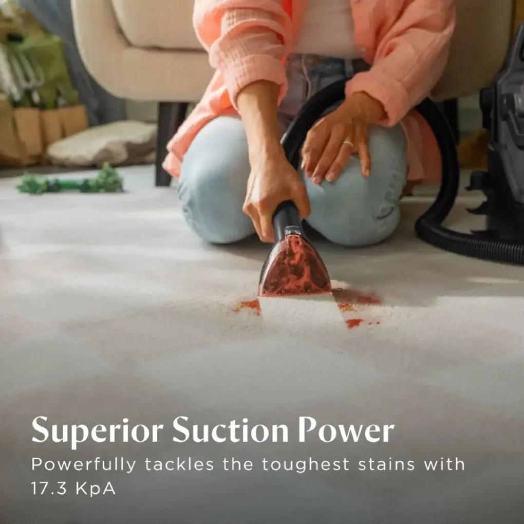 Combines strong suction, scrubbing brushes, and cleaning solution to lift dirt, spills, and tough stains effectively.