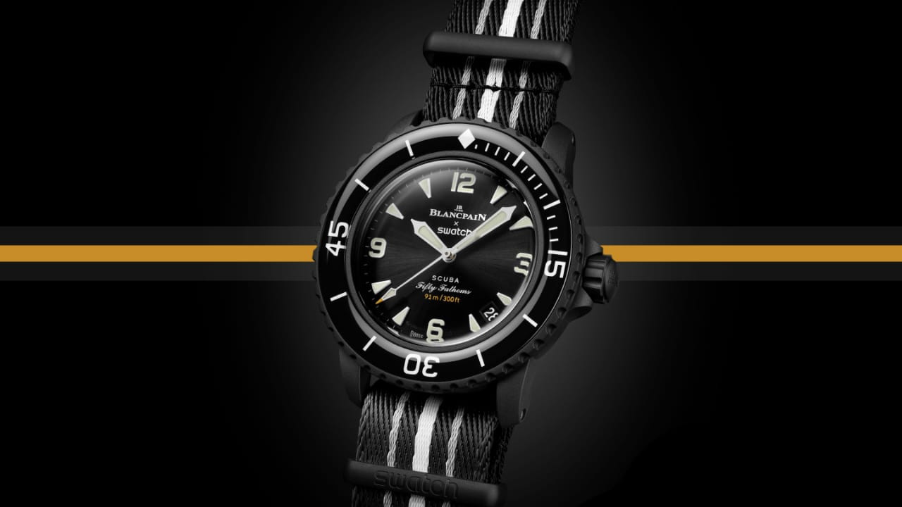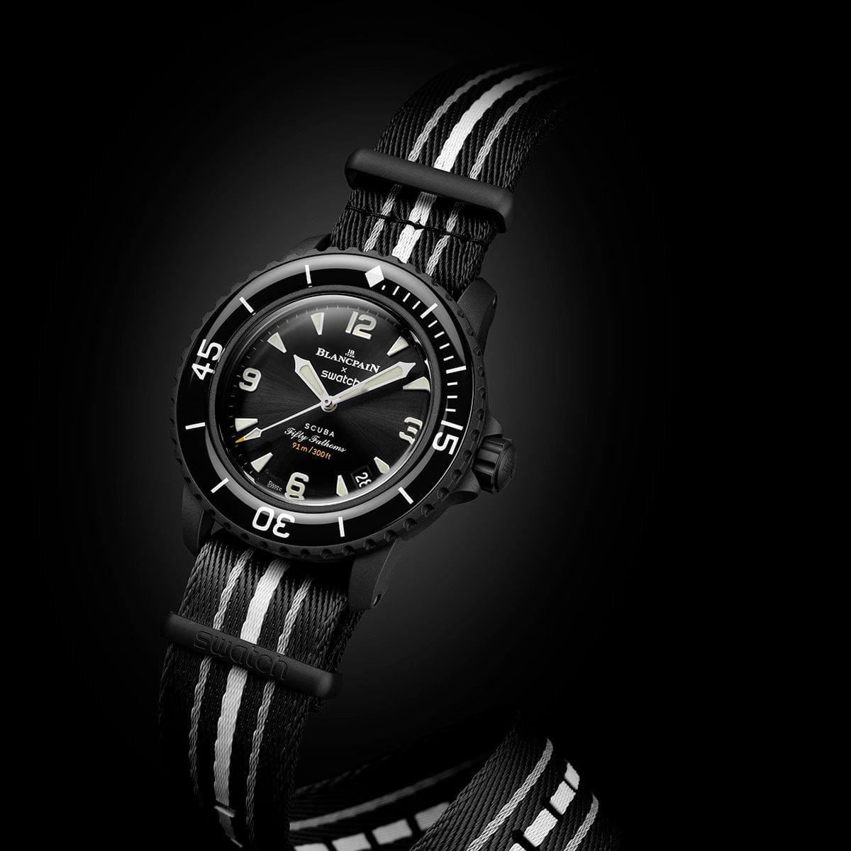 The Blancpain x Swatch Scuba Fifty Fathoms Ocean of Storms is inspired by Blancpain’s original Fifty Fathoms diver’s watch and presents a modern interpretation through contemporary materials and design. The watch features a black Bioceramic case and crown, paired with a black sunbrushed dial that includes a date display positioned between 4 and 5 o’clock. The overall design reflects a functional diving watch aesthetic while maintaining a clean and distinctive appearance.