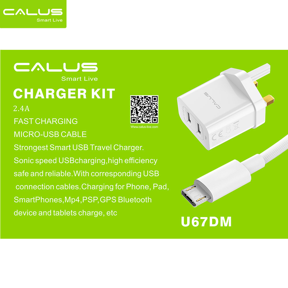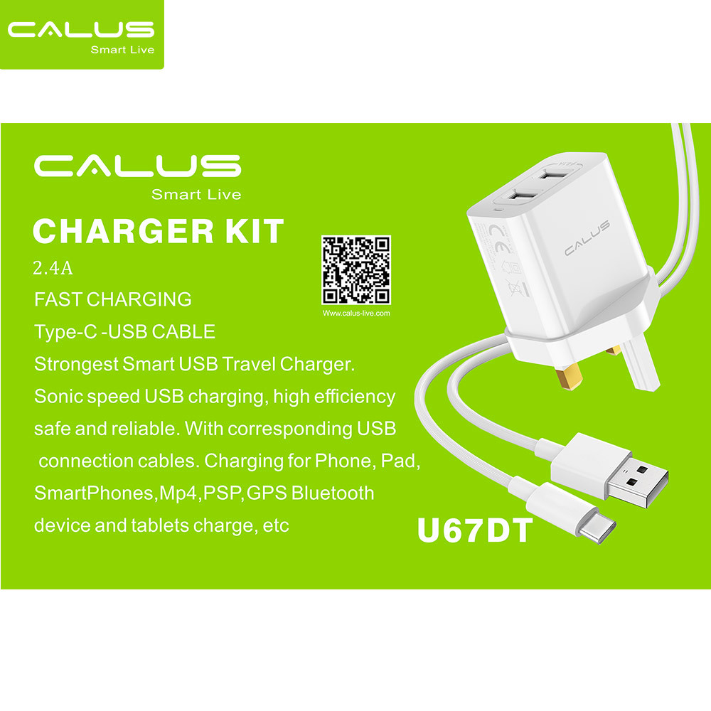 The CALUS U67D Charger is a compact and efficient wall adapter that comes with two USB ports, allowing you to charge two devices at the same time. It's perfect for travel, office use, or everyday needs, offering a sleek design and reliable performance for a smooth charging experience.