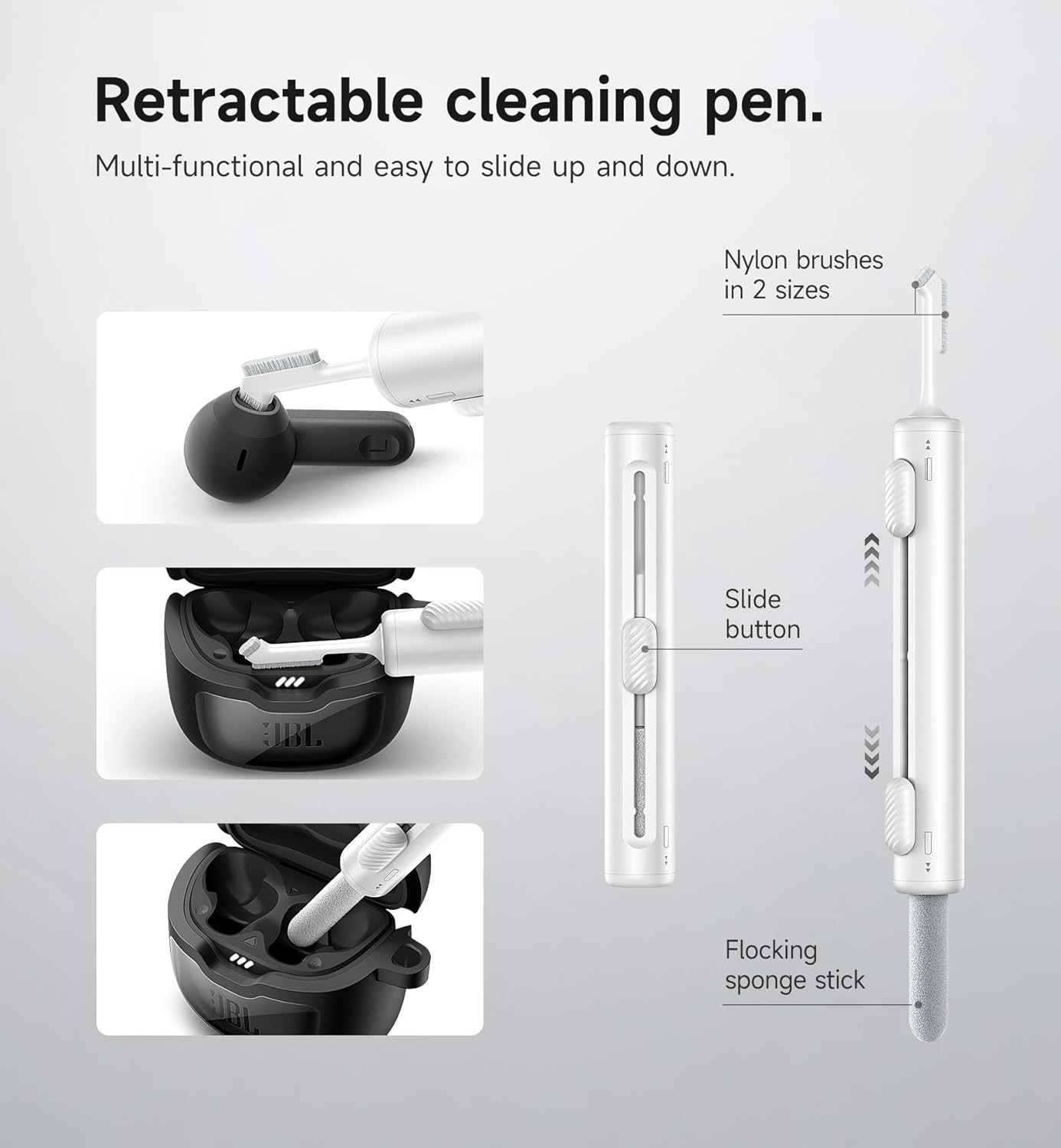 The 3-in-1 cleaning pen includes a fine metal tip, soft brush, and high-density flocking sponge—ideal for removing dust and dirt from the earbuds and charging case, keeping them spotless at all times.