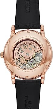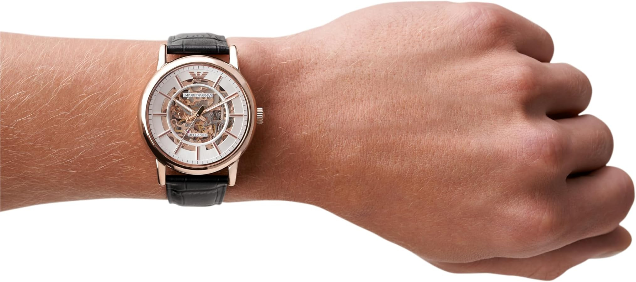 The Emporio Armani AR60027 is an analog wristwatch featuring a 43 mm round stainless steel case with rose gold–tone accents and a silver dial. The dial design includes visible mechanical detailing and is paired with a brown leather strap secured by a buckle closure. The overall design reflects a balanced combination of classic styling and functional construction.