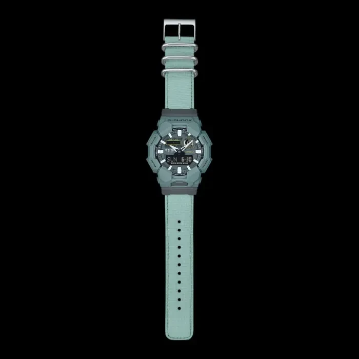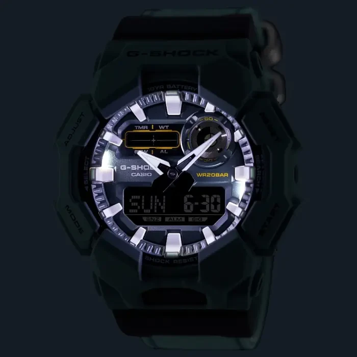Built for durability and performance, this Casio G-Shock features a strong Carbon Core Guard structure with a lightweight bio-based carbon and resin case paired with a rugged CORDURA® re/cor™ cloth band. Designed for active lifestyles, it offers 200-meter water resistance, shock resistance, and a powerful 10-year battery life. The analog-digital display provides world time across 31 time zones, precise stopwatch functions, countdown timer, five daily alarms, and bright Super Illuminator LED lighting. With Neobrite hands, hand-shift feature for clear digital viewing, and full auto-calendar to 2099, it’s a reliable everyday sports watch for travel, outdoor adventures, and daily wear.