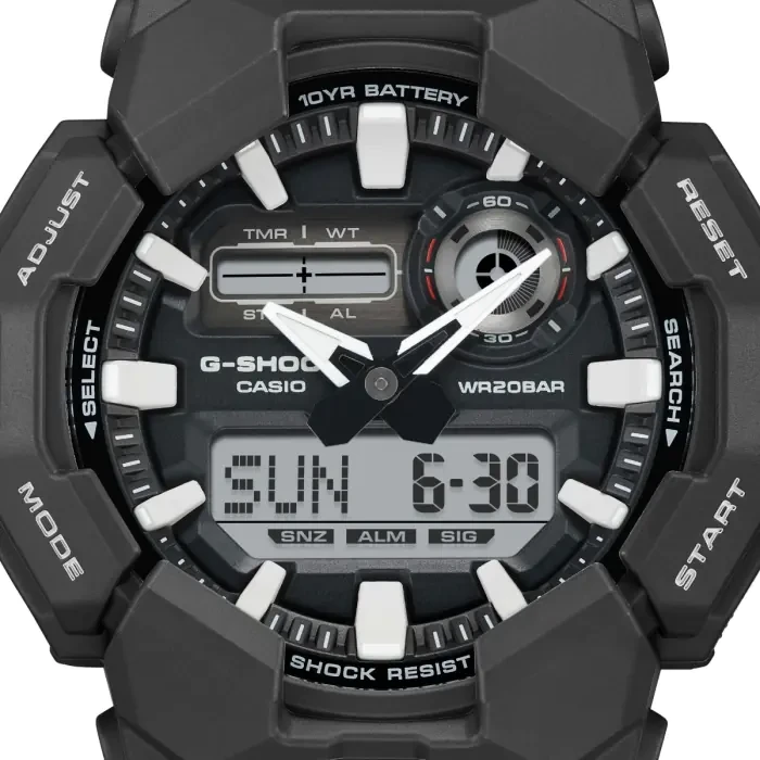 The white Super Illuminator LED light with selectable duration ensures clear visibility in low light, while the hand shift feature provides an unobstructed view of digital information. With a long-lasting 10-year battery, mineral glass protection, Neobrite luminous elements, and full auto-calendar up to year 2099, this G-Shock combines advanced functionality with long-term reliability.