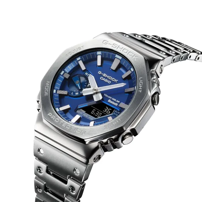Powered by Tough Solar technology, it ensures long-lasting performance while Bluetooth smartphone connectivity enables automatic time adjustment, reminders, phone finder, and easy world-time management across 38 time zones. The hand shift feature provides a clear view of the digital display when needed.