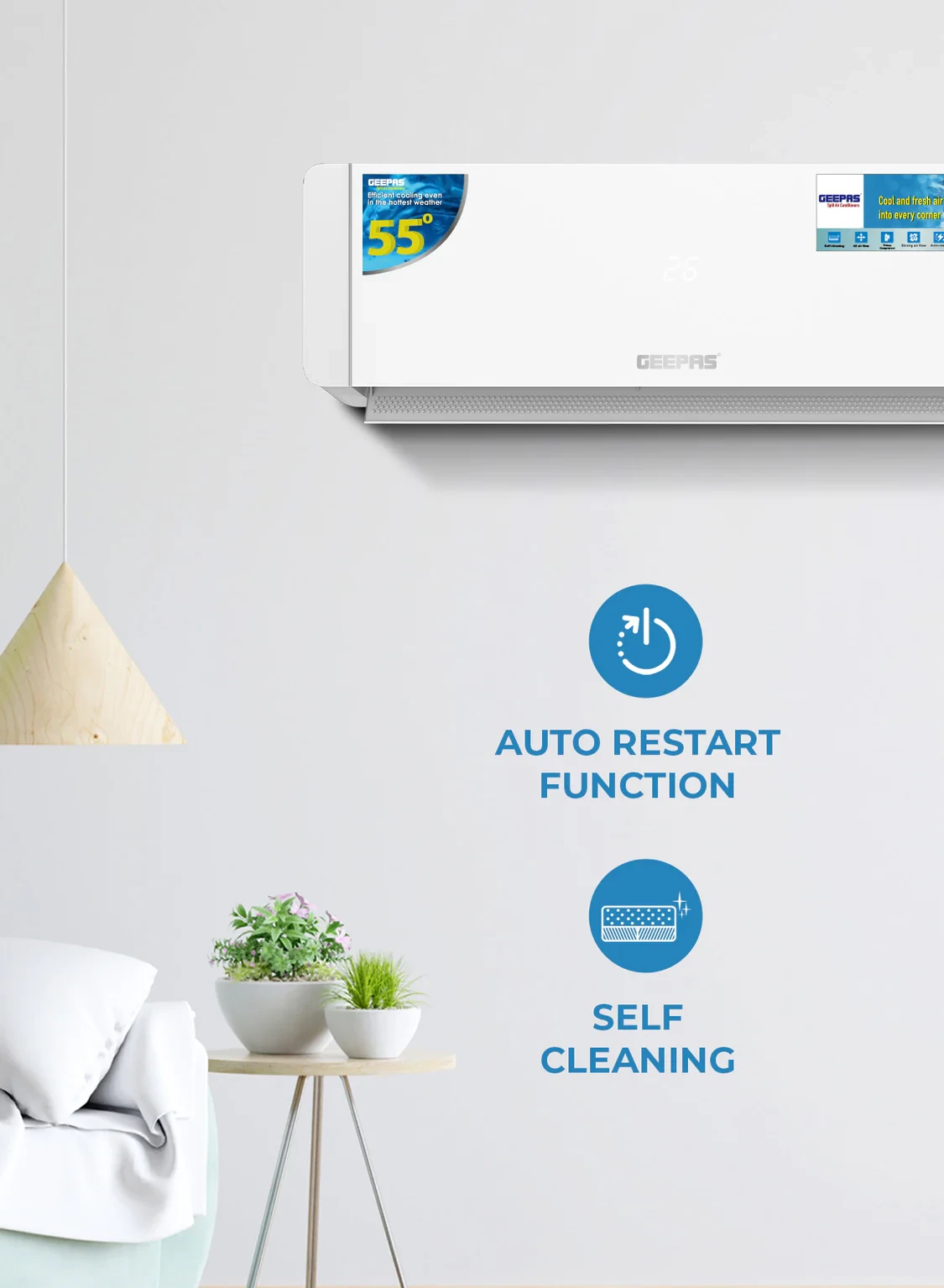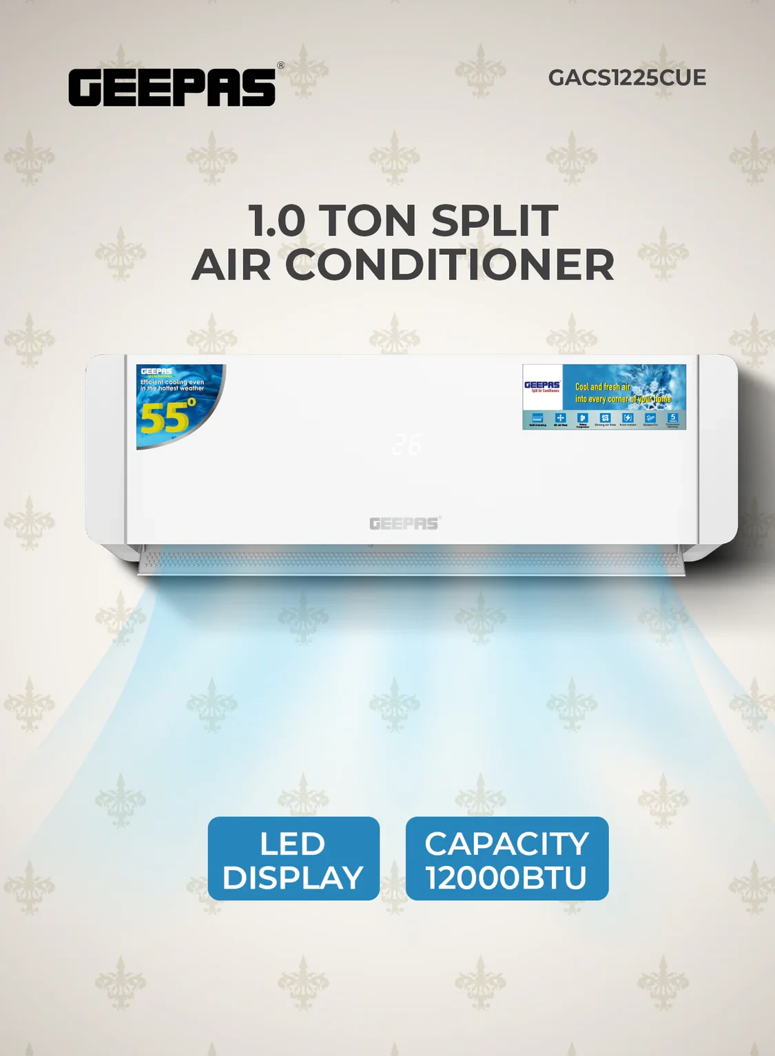 The Geepas GACS1225CUE 1 Ton Smart Split Air Conditioner is made for smart and efficient cooling in small to medium-sized rooms. It has a 12000 BTU cooling power and 4D air flow, which helps cool the room quickly and evenly. You can control it remotely using a smartphone app with Wi-Fi, and there's an LED screen to make it easy to see and adjust settings. The unit also has Golden Fin protection, which helps it last longer and resist damage from rust. It has a self-cleaning feature that makes cleaning simple, combining smart tech with dependable performance for everyday use.