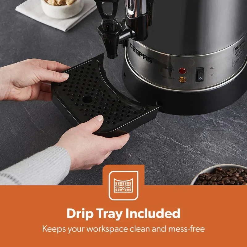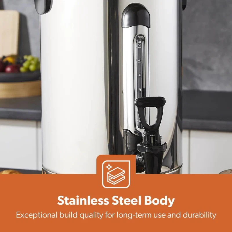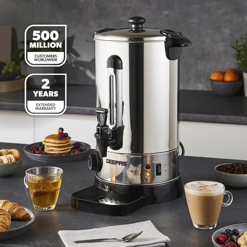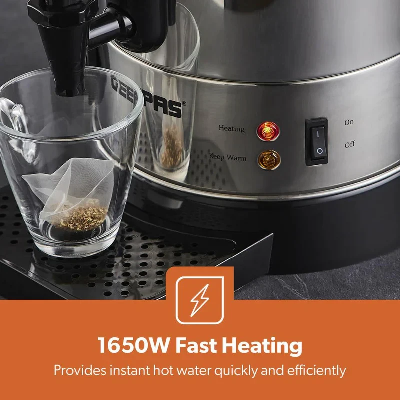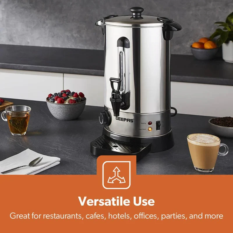 - 10L large capacity, great for home, office, or event use- 1650W high-performance heating element for quick boiling- Durable stainless steel construction for long-lasting use- Automatic shut-off for energy efficiency and safety- Boil-dry protection to prevent overheating- Easy-pour tap for convenient dispensing- Water level indicator for accurate filling- Cool-touch handle for safe handling- Detachable power cord for easy movement and storage- Suitable for making tea, coffee, soups, and other hot drinksSpecifications:- Brand: Geepas- Model: GK6155- Type: Electric Water Boiler / Hot Water Dispenser- Capacity: 10 Litres- Power: 1650W- Material: Stainless Steel- Safety Features: Auto Shut-Off, Boil-Dry Protection- Handle: Cool-Touch- Indicator: Water Level Display- Dispensing Type: Tap/Spout- Usage: Home, Office, Events, Catering- Color: Silver with Black Accents- Heating Speed: Fast & Energy Efficient
