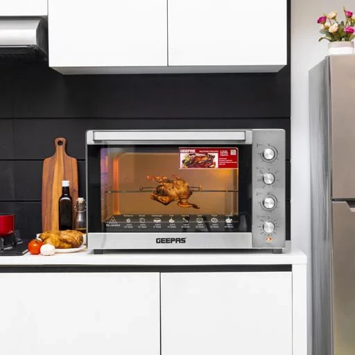 The Geepas 120L Multi-Function Oven GO34057 is a strong and roomy kitchen tool that works well for families and big events. It has a big 120L space and a high 2800W power, making it great for cooking a variety of foods quickly and evenly. It has both a rotisserie and convection setting, which helps in roasting, grilling, and baking food consistently. The 7 different heating levels let you adjust cooking as needed, and the 120-minute timer with a bell makes it easy to know when your meal is ready without having to check on it all the time. The oven is made from durable stainless steel, adding a sleek look to your kitchen while ensuring it lasts a long time.