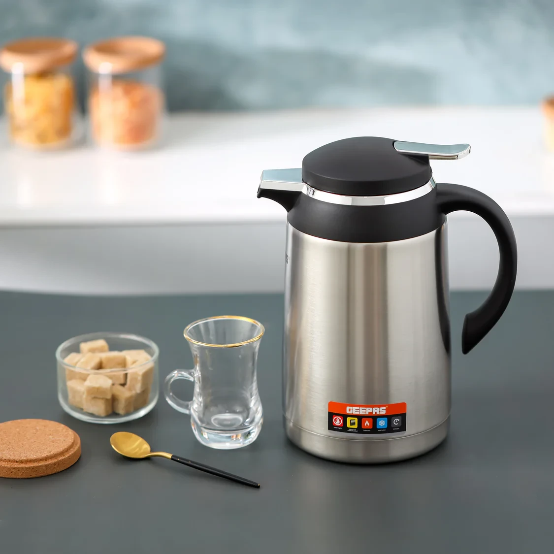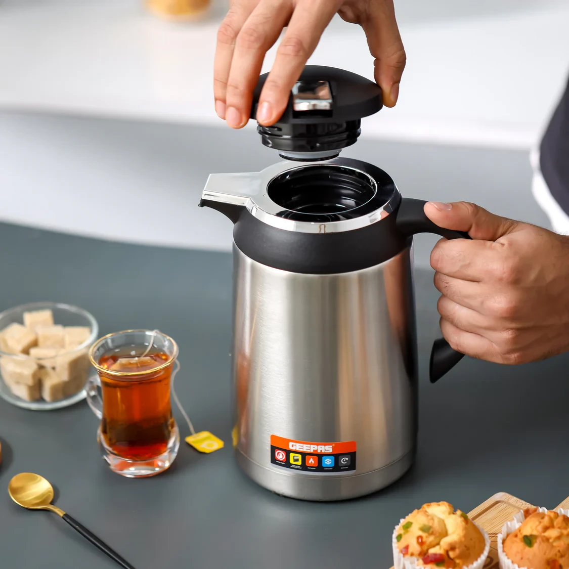 • A double-wall vacuum insulation keeps drinks hot or cold for up to 24 hours• 1.3-liter capacity suitable for both families and individuals• Leak-proof lid prevents any spills while you're traveling• Durable stainless steel body that lasts for a long time• Ergonomic handle for a comfortable grip and easy portability• Easy to clean and can be used over and over again• Works well with both hot and cold drinks like tea, coffee, water, and juices• Great for use at home, in the office, while camping or on outdoor tripsSpecifications:• Brand: Geepas• Model: GVF27023• Capacity: 1.3 liters• Material: Stainless steel• Insulation Type: Double-wall vacuum insulation• Hot Retention: Up to 24 hours• Cold Retention: Up to 24 hours• Lid Type: Leak-proof twist lid• Handle: Ergonomic easy-carry handle• Cleaning: Easy to clean inside and outside• Suitable For: Hot and cold beverages• Design: Sleek and durable• Color: Silver or metallic finish