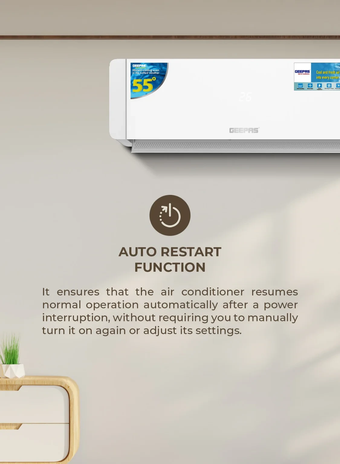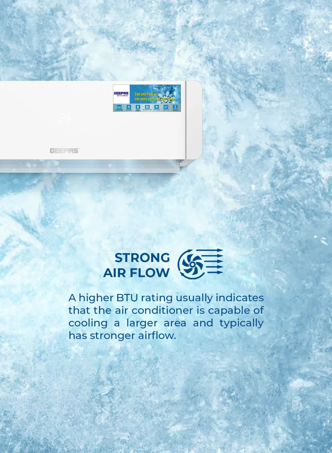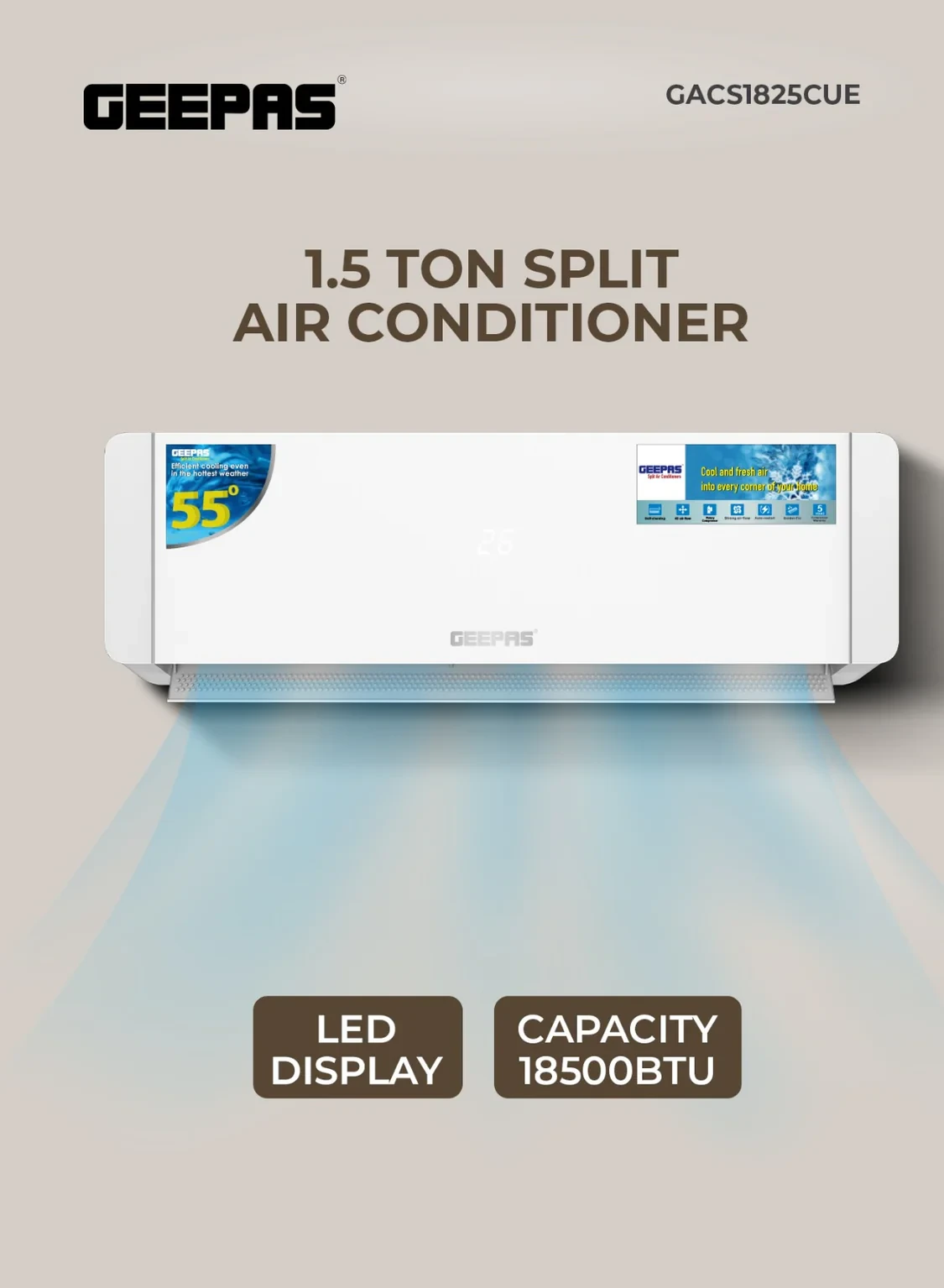 • 18500 BTU cooling capacity for quick and effective cooling• 4D air flow for even cooling throughout the room• Wi-Fi control for remote operation through a smartphone app• LED display for easy monitoring and control• Self-cleaning function for simple maintenance• Golden Fin protection to stop corrosion and increase durability• Modern and stylish design that fits any space• Energy-efficient and quiet operationSpecifications:• Brand: Geepas• Type: Smart Split Air Conditioner• Capacity: 1.5 Ton / 18500 BTU• Cooling Modes: Fast Cooling, Auto, Fan, Sleep• Control: Wi-Fi & LED Display• Airflow: 4D Air Flow• Safety Features: Self-Cleaning, Golden Fin Protection• Material: Metal & Plastic Body• Color: White• Suitable For: Homes, Offices, Medium to Large Rooms
