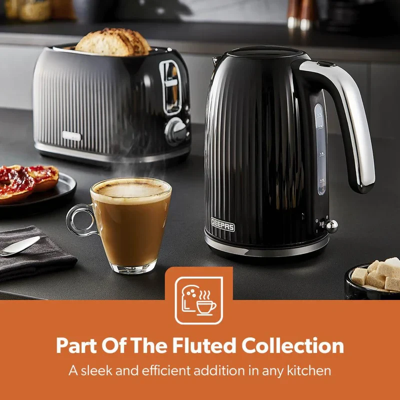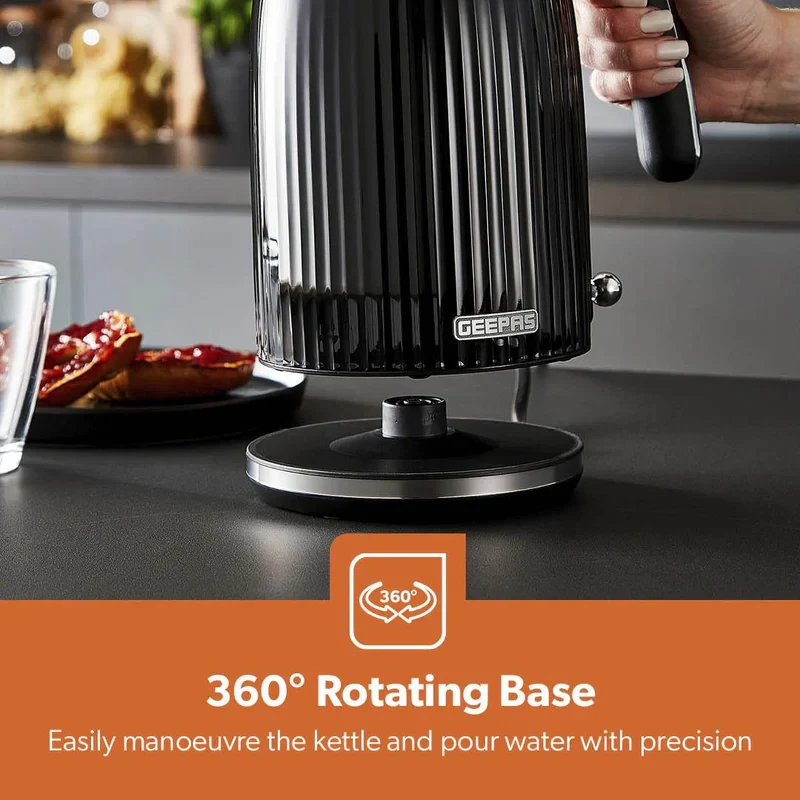 • 1.7L capacity, perfect for use at home or in the office• 3000W powerful element for fast boiling• Fluted black jug design for a neat and elegant look• Auto shut-off for safety and energy efficiency• Boil-dry protection to avoid overheating and damage• 360-degree cordless rotating base for easy movement• Ergonomic handle for a comfortable grip• Easy to clean and maintainSpecifications:• Brand: Geepas• Type: Electric Kettle• Capacity: 1.7 Litres• Power: 3000W• Material: Stainless Steel and Plastic• Base/Structure: 360-degree Cordless Rotating Base• Safety Features: Auto Shut-Off, Boil-Dry Protection• Handle/Grip: Ergonomic Design• Color: Black• Suitable For: Water, Tea, Coffee, and Other Hot Beverages