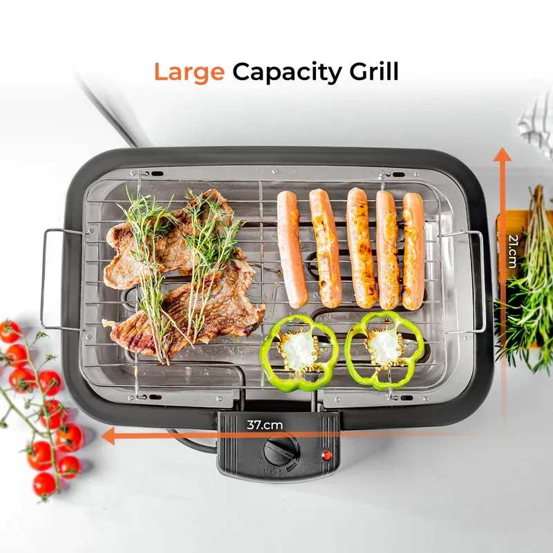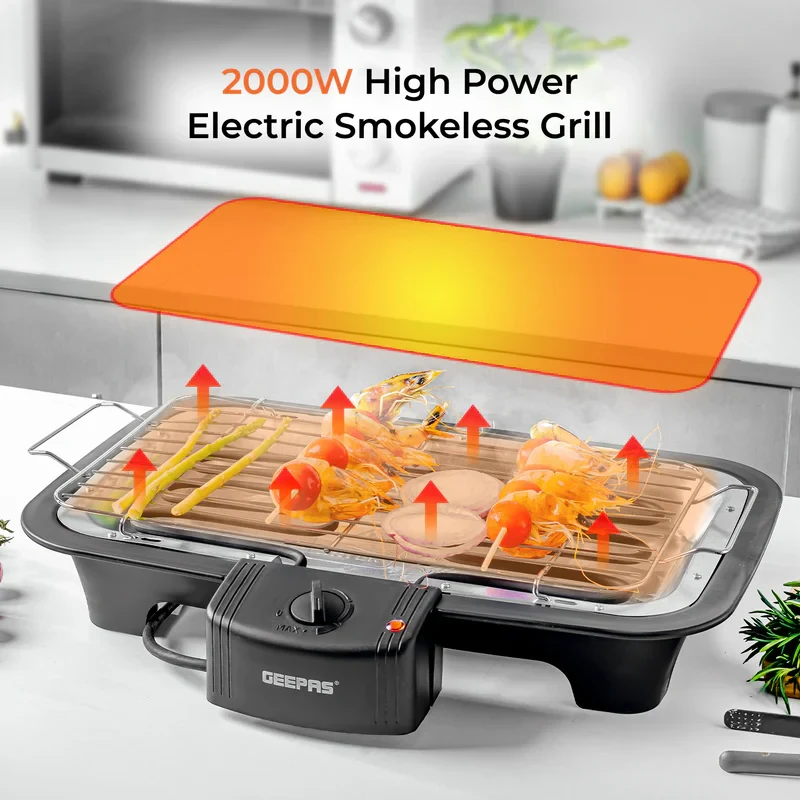 - A powerful 2000W heating element for fast and efficient grilling- Adjustable auto-thermostat for precise temperature control- Overheat protection to ensure safe and consistent use- Detachable heating element for easier cleaning and upkeep- Large grilling surface that can handle multiple dishes at once- Removable drip tray to collect excess oil and grease- Perfect for both indoor and outdoor use- Compact, sturdy, and easy to store when not in useSpecifications:- Brand: Geepas- Power: 2000W- Control Type: Auto-thermostat with adjustable temperature settings- Safety Feature: Overheat protection- Heating Element: Detachable for simple cleaning- Grill Surface: Large, non-stick cooking area- Drip Tray: Removable for easy grease collection- Suitable For: Meat, fish, vegetables, and more- Usage: Both indoor and outdoor cooking- Design: Compact and easy to store