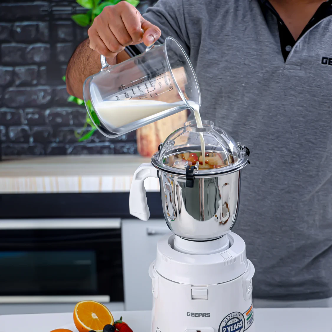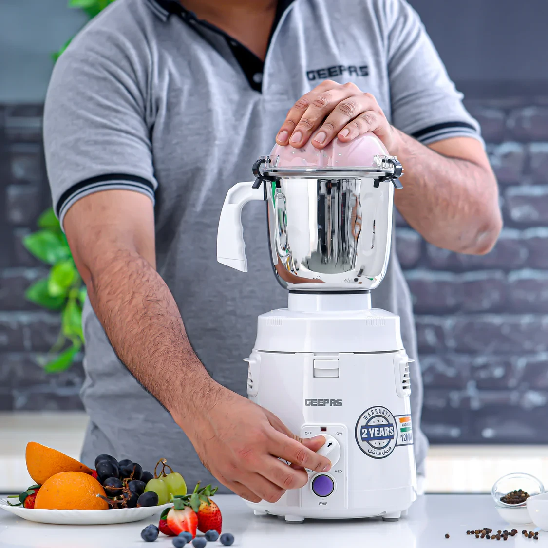 The Geepas GSB44114 3-in-1 Mixer Grinder is designed for powerful, efficient, and versatile use in the kitchen. It comes with a high-torque 1200W motor that ensures excellent grinding and blending results, even for the toughest ingredients. The mixer includes stainless steel jars and blades, which are both durable and maintain their sharpness over time. The jar caps are made to be unbreakable, providing safety and reliability during use. The machine is equipped with Multi-Safe Function and anti-slip feet, which contribute to a stable and secure operation. The 3-speed control along with a pulse function allows for easy adjustment of speed, making it simple to achieve precise results when grinding, blending, or mixing.