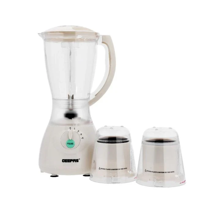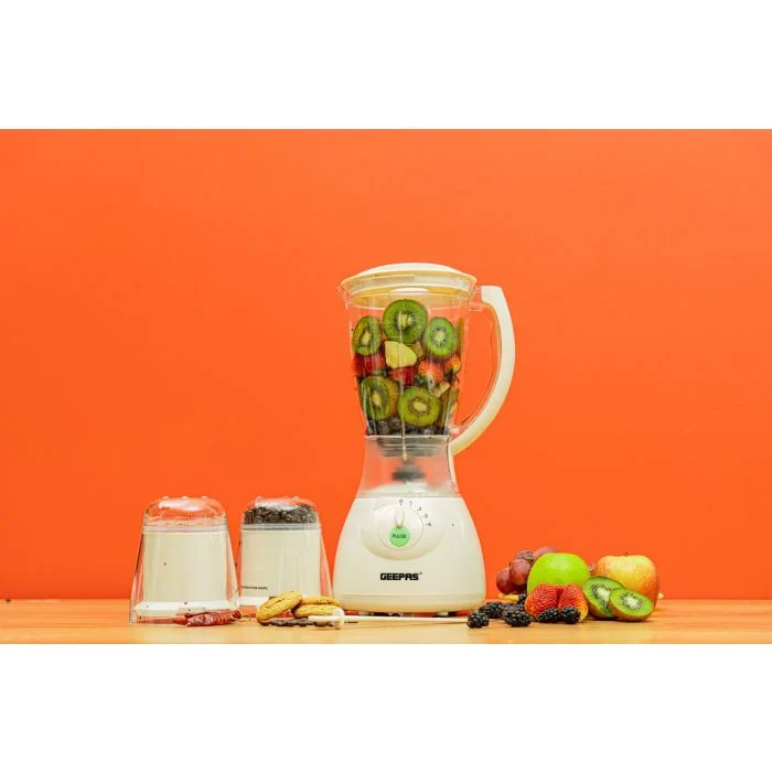 The Geepas 3-in-1 Multifunctional Blender is an ideal all-in-one tool for blending, grinding, and making smoothies. Its 400W motor ensures strong performance for everyday kitchen tasks. The 1.5L blending jar makes it easy to prepare juices, shakes, and smoothies for the whole family, and the coffee grinder attachment can handle spices, nuts, and beans with ease. With four speed settings and a pulse function, you have full control over the texture and consistency of your creations. The blender features stainless steel blades that provide long-lasting durability and smooth results. It also includes a safety lock system and overheat protection to ensure safe and reliable operation.