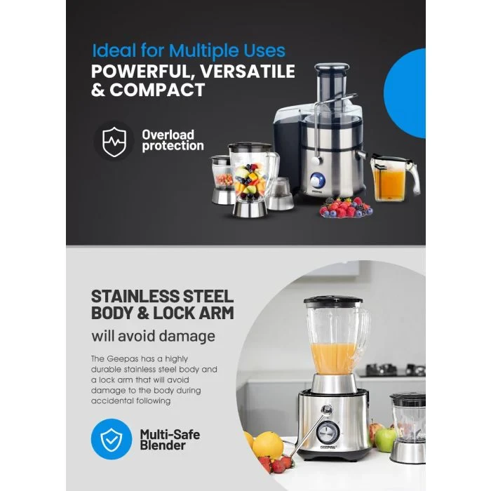 The Geepas 4-in-1 Juicer & Blender GSB5451 is a great all-in-one tool for your kitchen, offering power, efficiency, and lots of uses. It has an 800W stainless steel motor that can handle a wide range of tasks, including making fresh juice from fruits, blending smoothies, and grinding spices. The wide feeding tube makes it easy to add large pieces of fruit or vegetables, and the two speed settings along with a pulse function let you adjust the settings for different ingredients. The jars are made of unbreakable material and the whole unit is built to last, making it a reliable choice for all your food preparation needs.