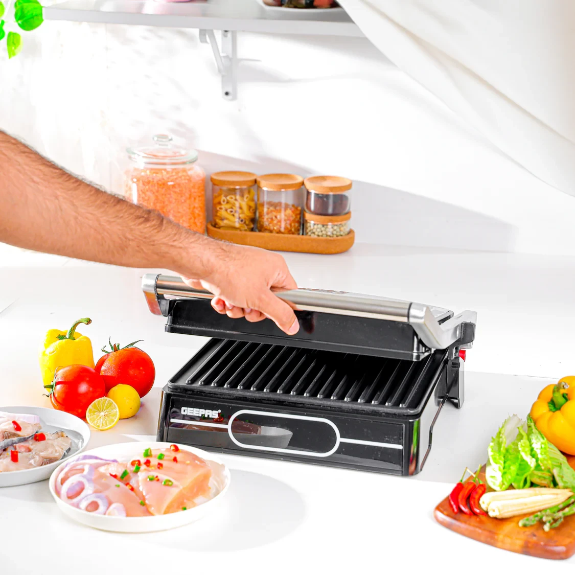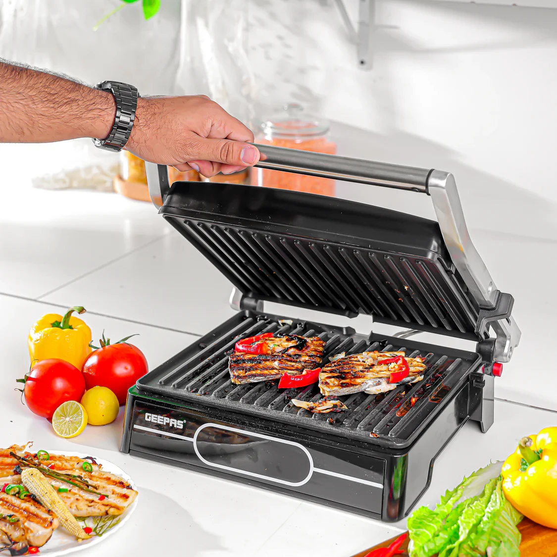 • 2000W high power delivers quick and even grilling performance• 4-slice capacity perfect for serving larger portions• Digital temperature control with 9 adjustable heat levels for precise cooking• Manual adjustable height for grilling various thicknesses of food• Non-stick plates for easy food release and simple cleaning• Compact and stylish black design that fits well in modern kitchens• Cool-touch handle and anti-slip base for added safety and stability• Ideal for grilling sandwiches, meats, vegetables, and paninisSpecifications:• Brand: Geepas• Model: GGM36557• Power: 2000W• Capacity: 4 slices• Control Type: Digital temperature control (9 levels)• Height Adjustment: Manual adjustable height system• Plate Type: Non-stick grill plates• Safety Feature: Cool-touch handle, anti-slip base• Color: Black• Heating: Quick and even distribution• Suitable For: Sandwiches, meats, vegetables, paninis, snacks