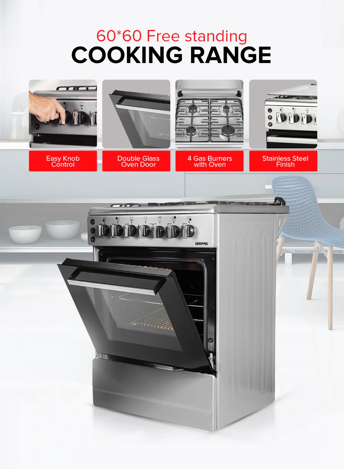 4 Gas Burners: Ensure steady and even heat across the cooking surface.