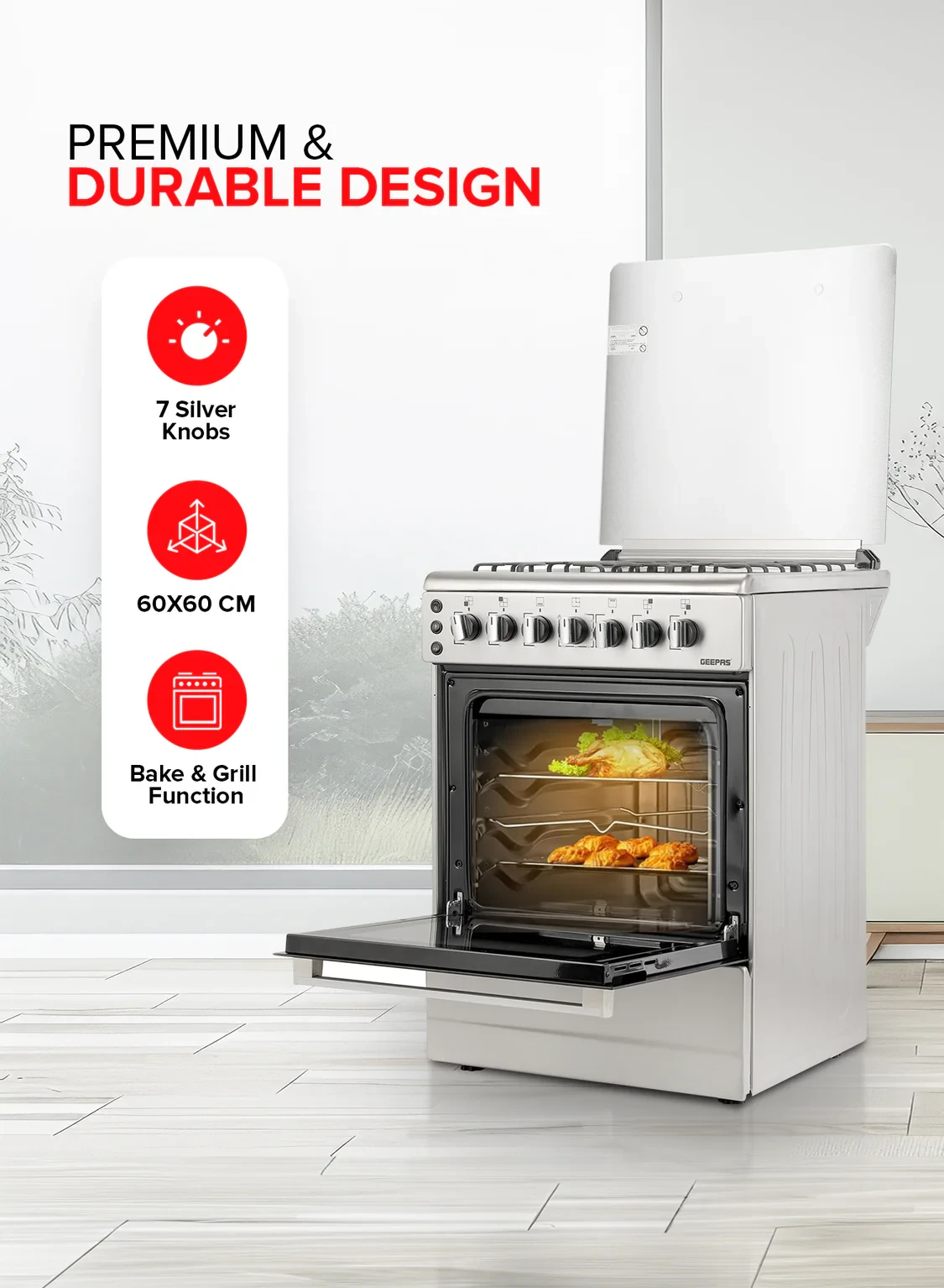 The Geepas GCR6059 Free Standing Cooking Range brings together power, efficiency, and a sleek look to help you cook better. It has a strong stainless steel body and measures 60x60cm, making it a great fit for modern kitchens. This range includes four gas burners that provide even heat, helping you cook with accuracy, and a built-in oven with bake, grill, and rotisserie settings for a variety of meal options. The auto ignition system makes it easy and safe to light the burners with just a simple turn of the knob. Whether you're cooking, baking, or grilling, this appliance offers both strong performance and long-lasting reliability.