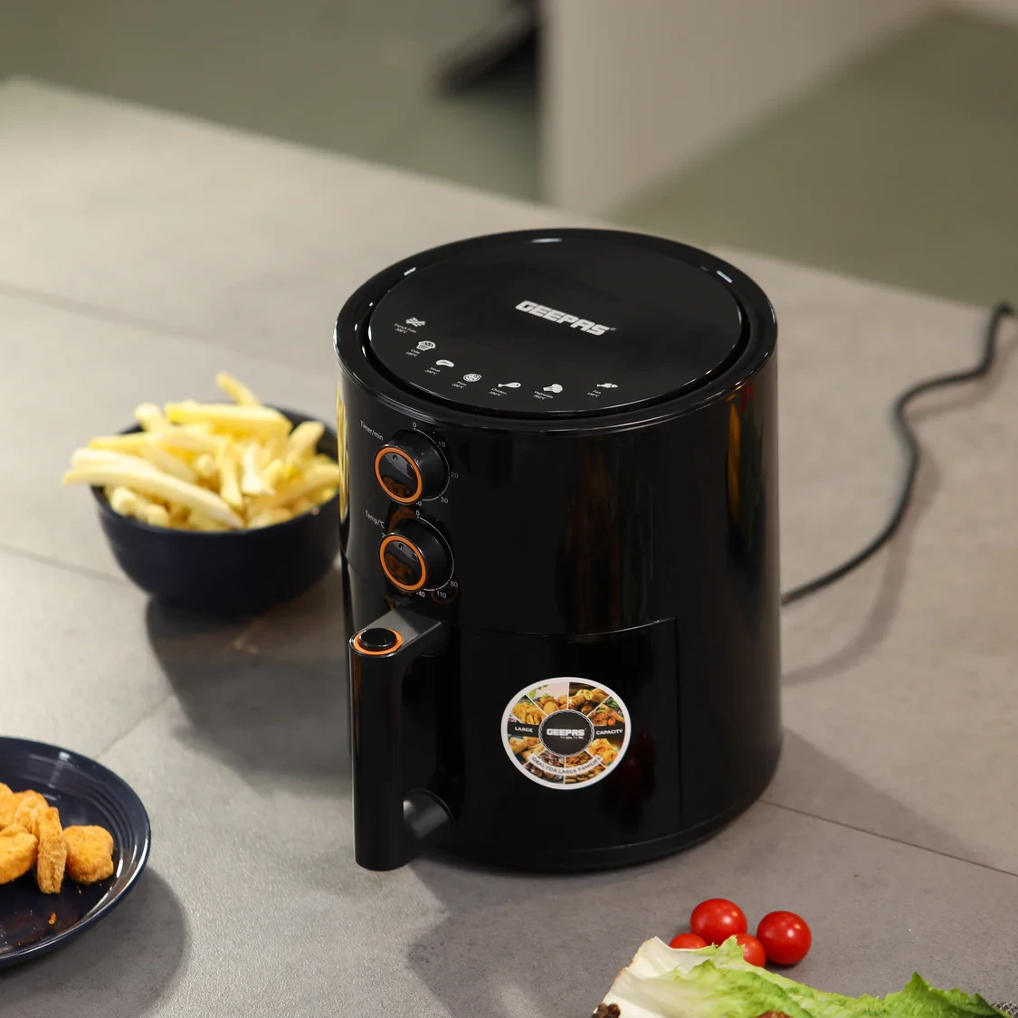 Enjoy tasty, oil-free meals with the Geepas Air Fryer GAF37513, which uses advanced Vortex Frying Technology to spread heat evenly, giving you crispy and healthy results. Its 4.0L non-stick coated pot is perfect for making many kinds of dishes like frying, roasting, grilling, or baking, all with little or no oil. You can control the temperature between 80°C and 200°C, and the 1 to 60-minute timer lets you set the perfect cooking time. The design makes it easy to clean and store, and its sleek black look fits well in any modern kitchen.