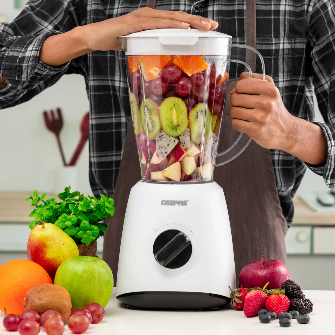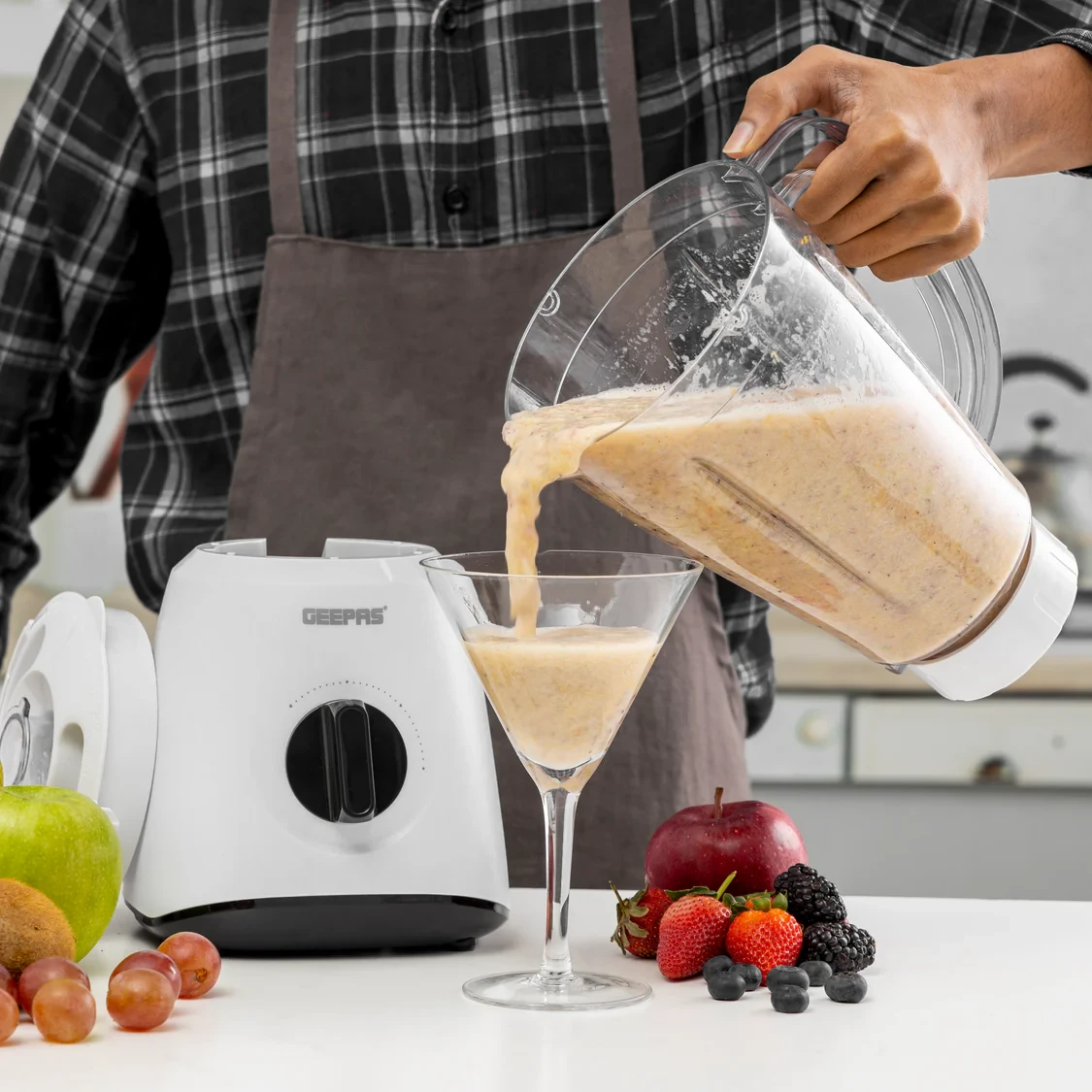 The Geepas Blender GSB9894N is made to blend smoothly and efficiently for everyday use in the kitchen. It has a strong 400W motor that makes it easy to blend fruits, veggies, ice, and other ingredients into smoothies, soups, and sauces. The 1.5L glass jar is strong and can hold enough for family meals, and the sharp stainless steel blades help make blending fast and even. With two speed settings and a pulse function, you can adjust how thick or smooth your mix turns out. The solid base and compact, modern look make it a dependable and stylish choice for any kitchen.