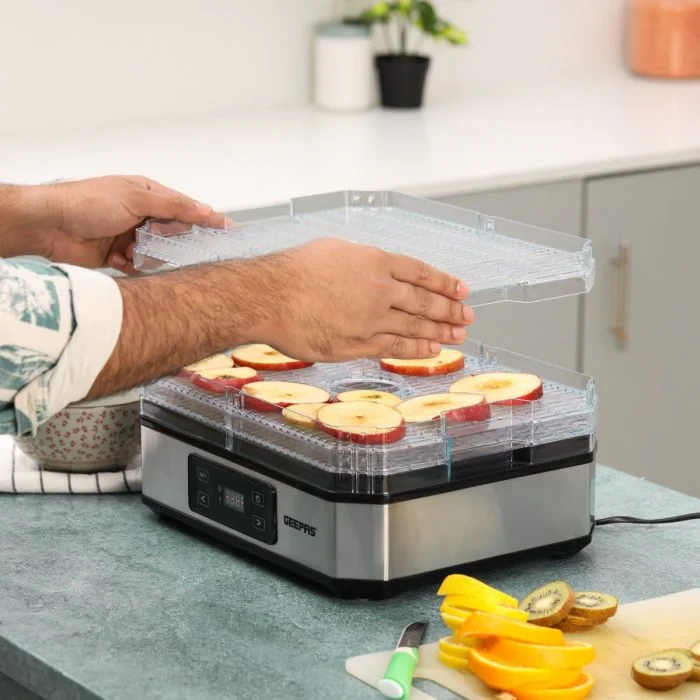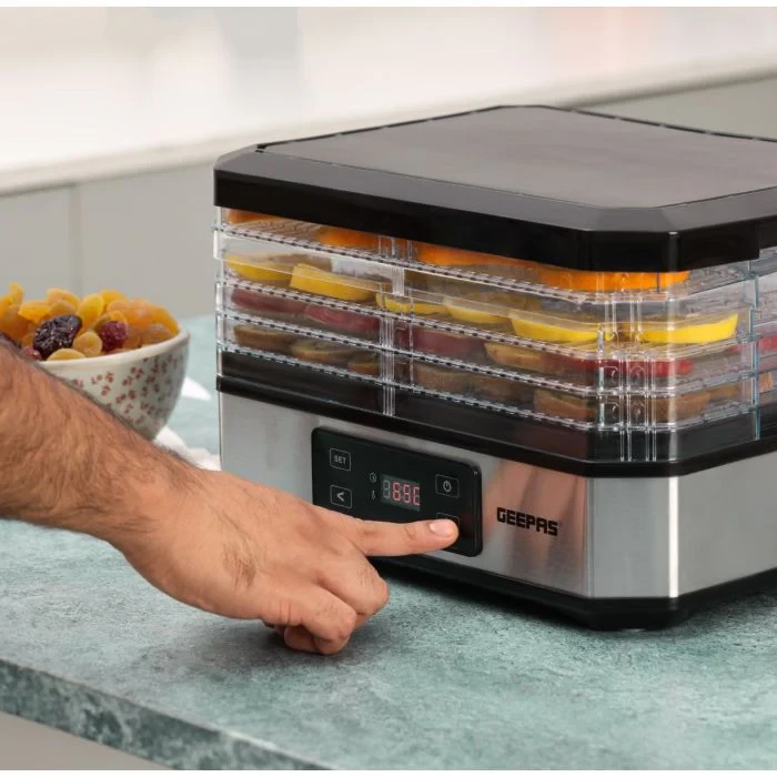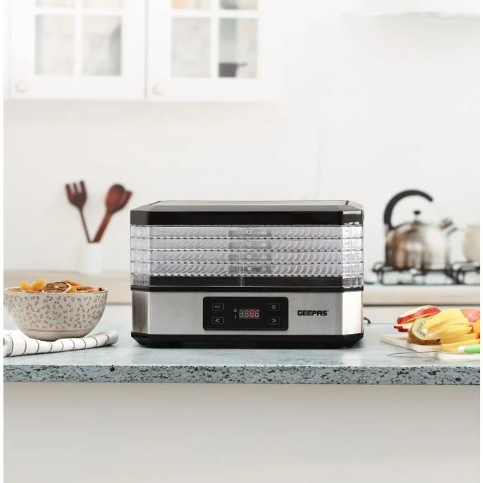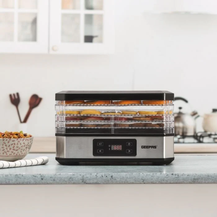 The Geepas GFD63013N Digital Food Dehydrator is a helpful and easy-to-use appliance that helps dry and keep a variety of foods fresh for longer. It comes with 5 stackable trays, making it simple to dehydrate fruits, veggies, herbs, meats, and other foods all at once. You can adjust the temperature to suit each type of food, and the 48-hour timer helps you set the exact drying time you need. Powered by a 500W motor, it spreads heat evenly to help keep the food’s natural taste, color, and nutrients. The digital panel, small size, and quiet running make it great for making healthy snacks and storing food for the future.