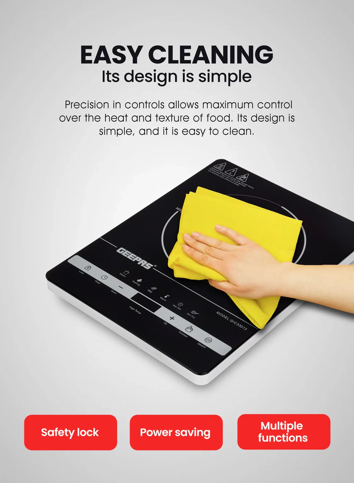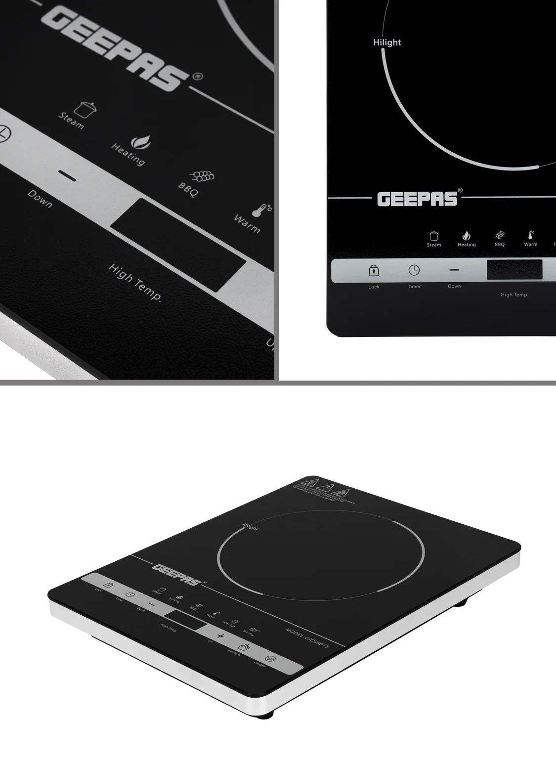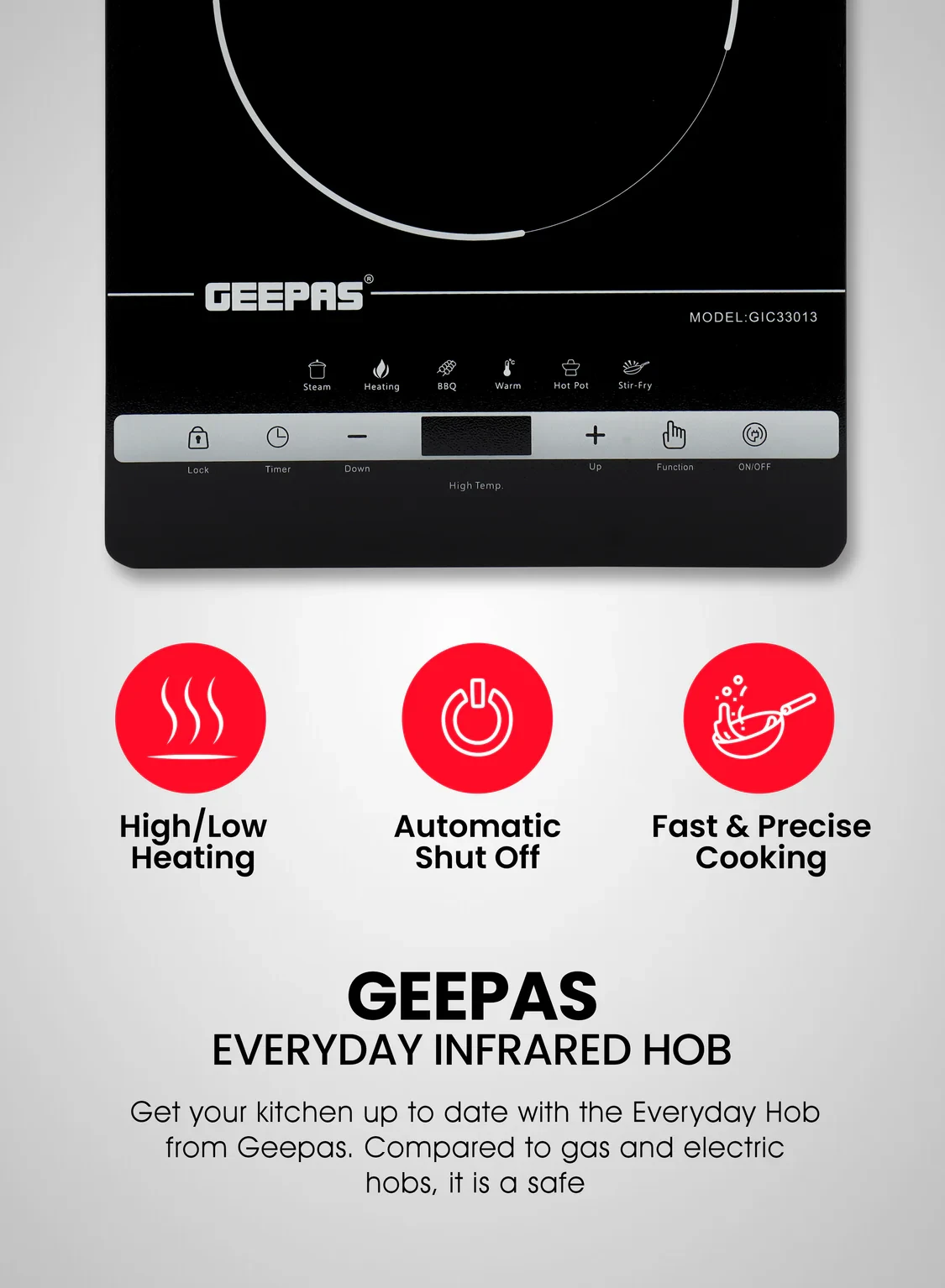 • A 2000W ceramic heating element for fast and even heating• A touch control panel for easy use• An LED display that shows the settings clearly• 10 power levels for different cooking needs• A built-in timer to help with cooking times• Safety features for a worry-free experience• A sleek and small design that fits well in any kitchen• Energy-saving and easy to cleanSpecifications:• Brand: Geepas• Type: Digital Infrared Cooker• Power: 2000W• Material: Ceramic Heating Element and Plastic Body• Safety Features: Overheat Protection and Auto Shut-Off• Controls: Touch Control• Display: LED Display• Color: Black• Suitable For: Cooking, Boiling, Simmering, and Stir-Frying