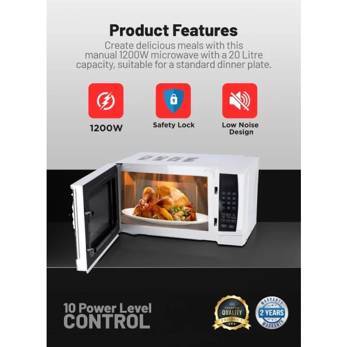 - 20-liter capacity, good for small to medium meals- 1200W power for fast and efficient cooking- Digital control panel for simple operation- One-touch cooking functions for convenience- Defrost and reheat options for added versatility- Compact and stylish design- Easy to clean and maintain- Perfect for cooking, reheating, and defrostingSpecifications:- Brand: Geepas- Type: Digital Microwave Oven- Capacity: 20 Litres- Power: 1200W- Control: Digital Panel- Cooking Functions: One-Touch, Defrost, Reheat- Safety Features: Overheat Protection- Handle/Grip: Ergonomic Design- Color: Silver & Black- Suitable For: Cooking, Reheating, Defrosting