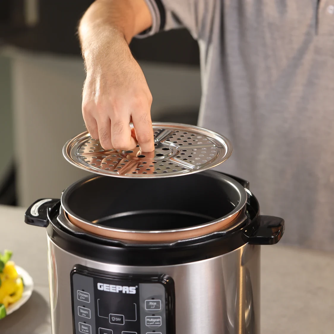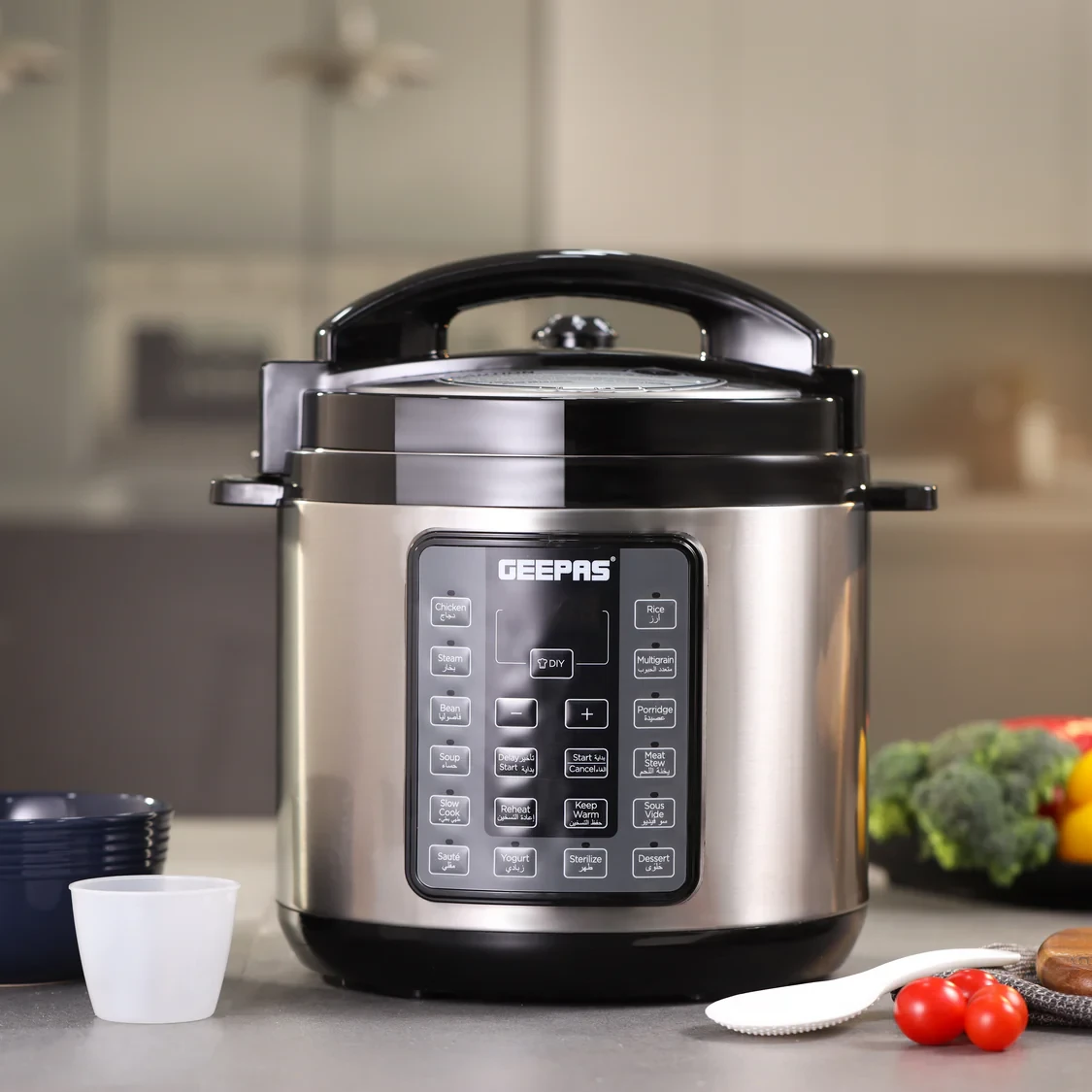 - 6L large capacity ideal for family-sized meals- 14 intelligent pre-set cooking programs for versatile meal options- 1000W high power ensures fast and efficient cooking- Easy-to-read LED digital display for precise control- Non-stick inner pot for hassle-free cleaning- Multi-function use – cook rice, soups, curries, porridge, pasta & more- Adjustable temperature and timer settings- Keep Warm function maintains food temperature until serving- Safety protection features for safe operation- Sleek, modern design fits perfectly in any kitchen setupSpecifications:- Brand: Geepas- Model: GMC5326- Type: Digital Multi Cooker- Capacity: 6 Liters- Power: 1000W- Programs: 14 Intelligent Cooking Modes- Display: LED Digital Screen- Inner Pot: Non-Stick, Removable- Functions: Cook, Steam, Slow Cook, Keep Warm & More- Control Type: Touch Button- Safety Features: Overheat Protection, Pressure Safety Lock- Body Material: Durable Plastic & Stainless Steel- Color: Silver/Black- Power Indicator: Yes- Easy to Clean & Maintain