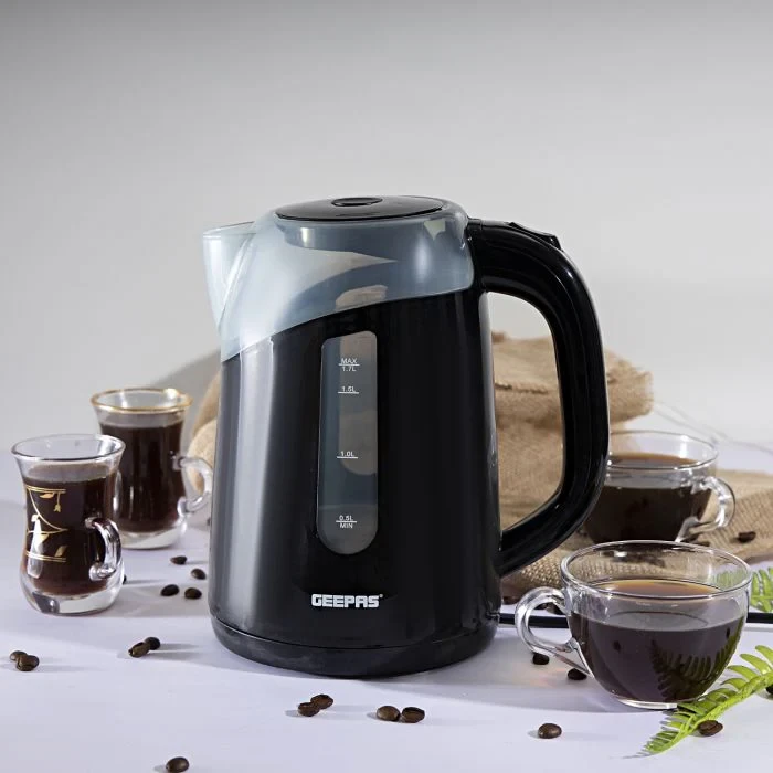 • 1.7-liter size that works well for families and offices• 2200W heating element for fast boiling• Double-wall design for better insulation and longer life• Auto shut-off to save energy and prevent accidents• Boil-dry protection to stop overheating• 360-degree cordless base for easier pouring and movement• Ergonomic handle for a better grip and comfortable use• Perfect for making tea, coffee, milk, water, and other hot beveragesSpecifications:• Brand: Geepas• Type: Electric Kettle• Capacity: 1.7 Litres• Power: 2200W• Material: Stainless Steel and Plastic• Base/Structure: 360-Degree Cordless Rotating Base• Safety Features: Auto Shut-Off, Boil-Dry Protection• Handle/Grip: Ergonomic Design• Color: Silver• Suitable For: Tea, Coffee, Milk, Water, and Other Hot Beverages